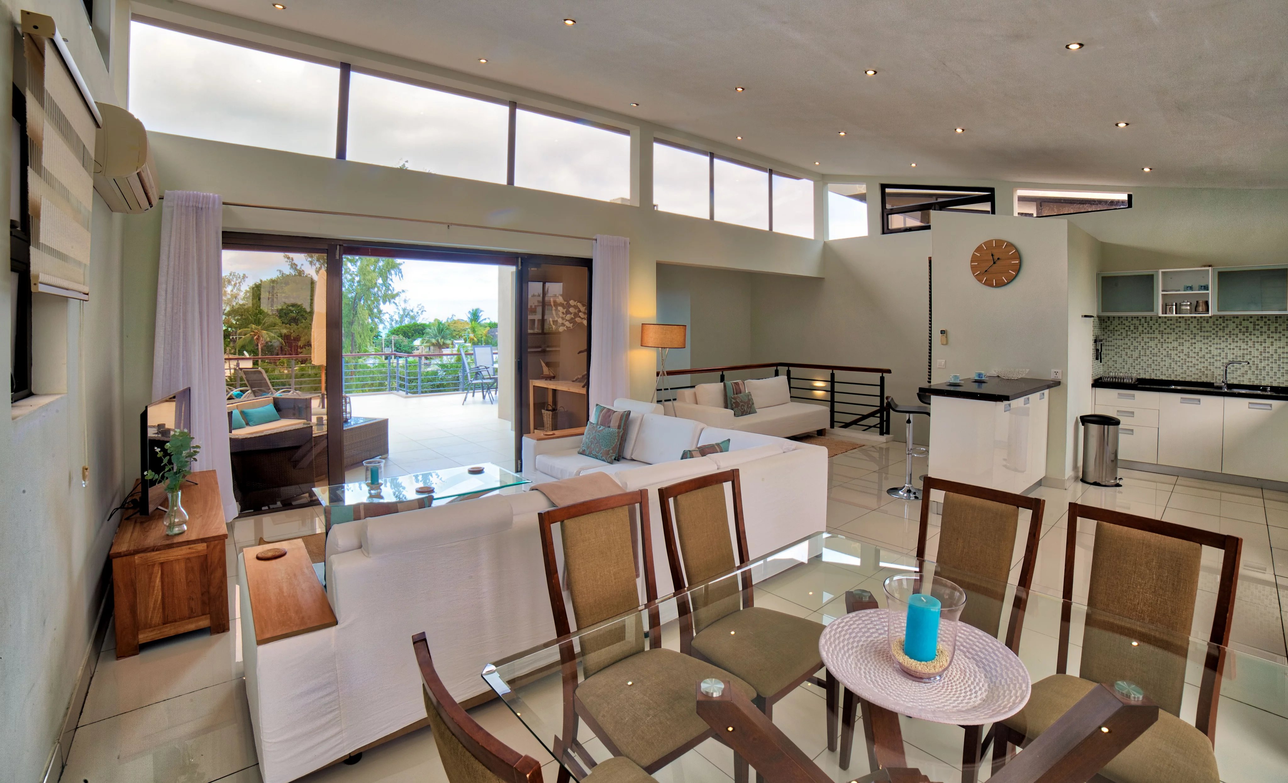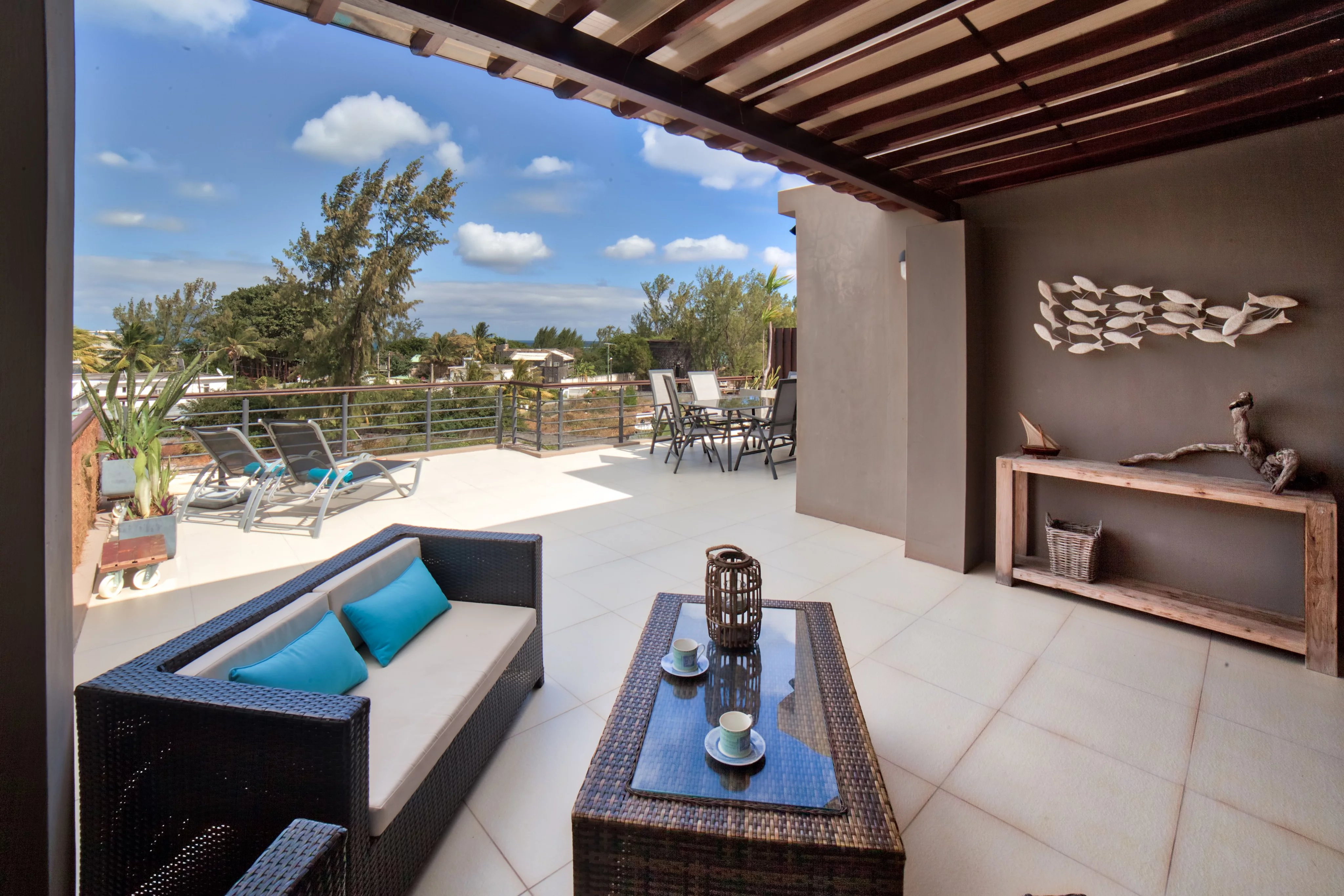 Outside, the spacious 54 square metre terrace is furnished with garden furniture, a parasol, sun loungers and a dining table.