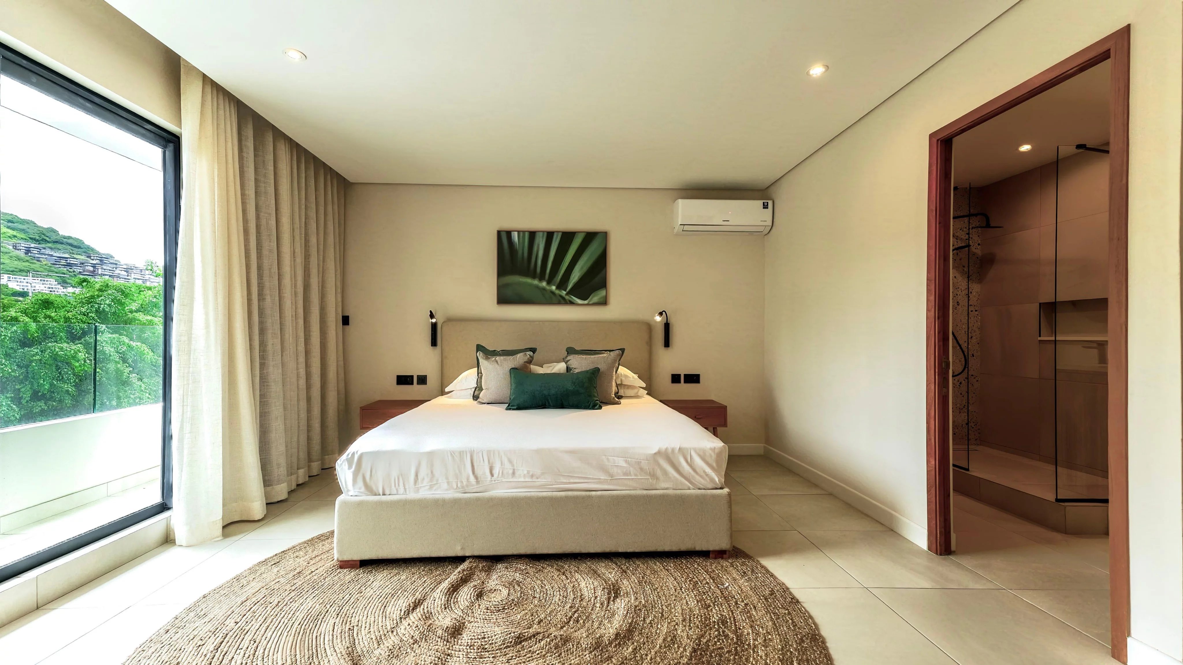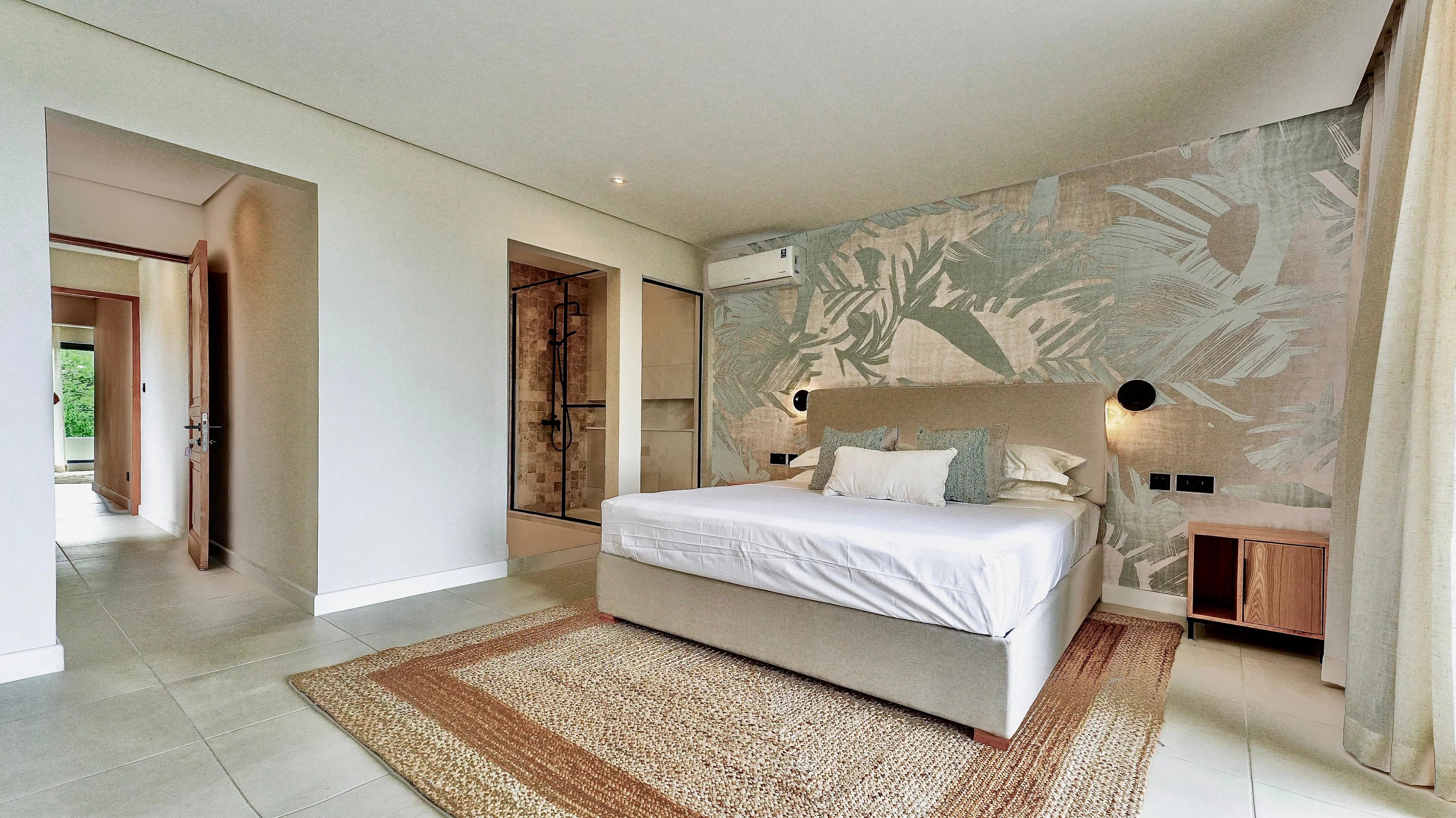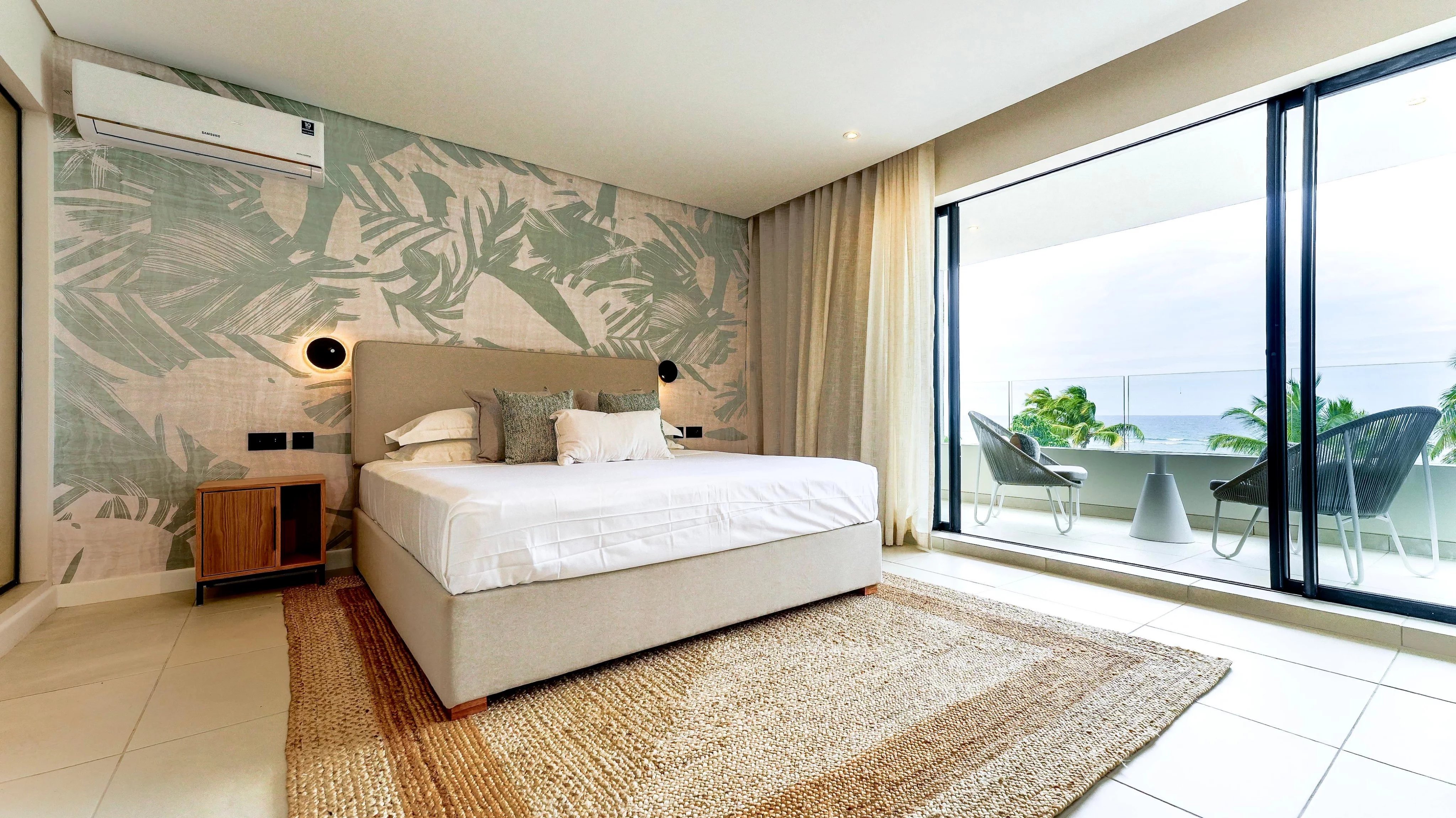 The duplex features three elegant en-suite bedrooms, including a convenient ground-floor suite ideal for guests or multigenerational living. The sea-facing master suite provides a peaceful retreat, while the bright, open-plan living and dining area flows effortlessly onto a private terrace and swimming pool, creating the perfect space to relax or entertain. High-end finishes, complemented by a carefully curated décor package and warm wood accents, enhance the sophisticated tropical aesthetic.