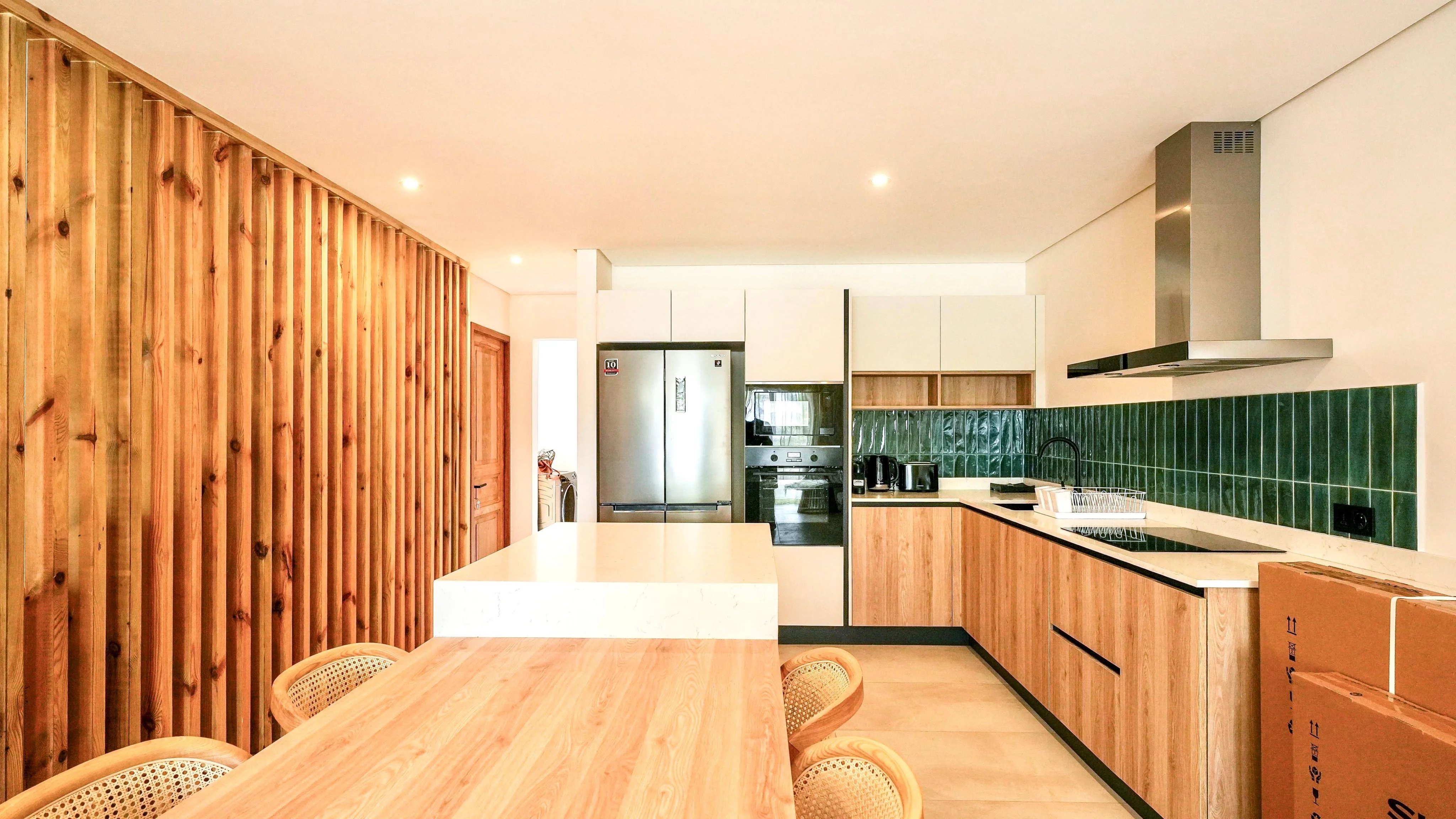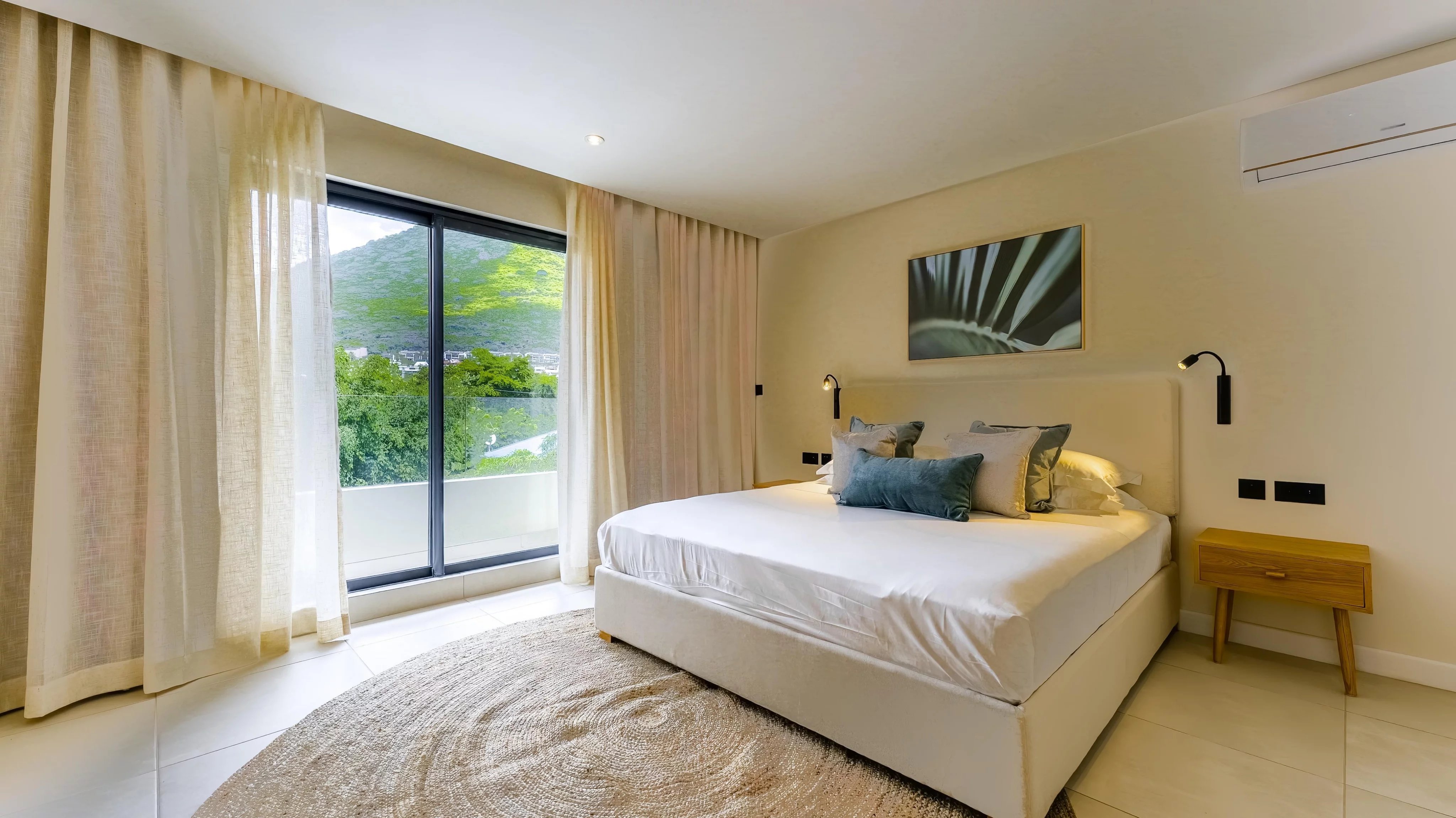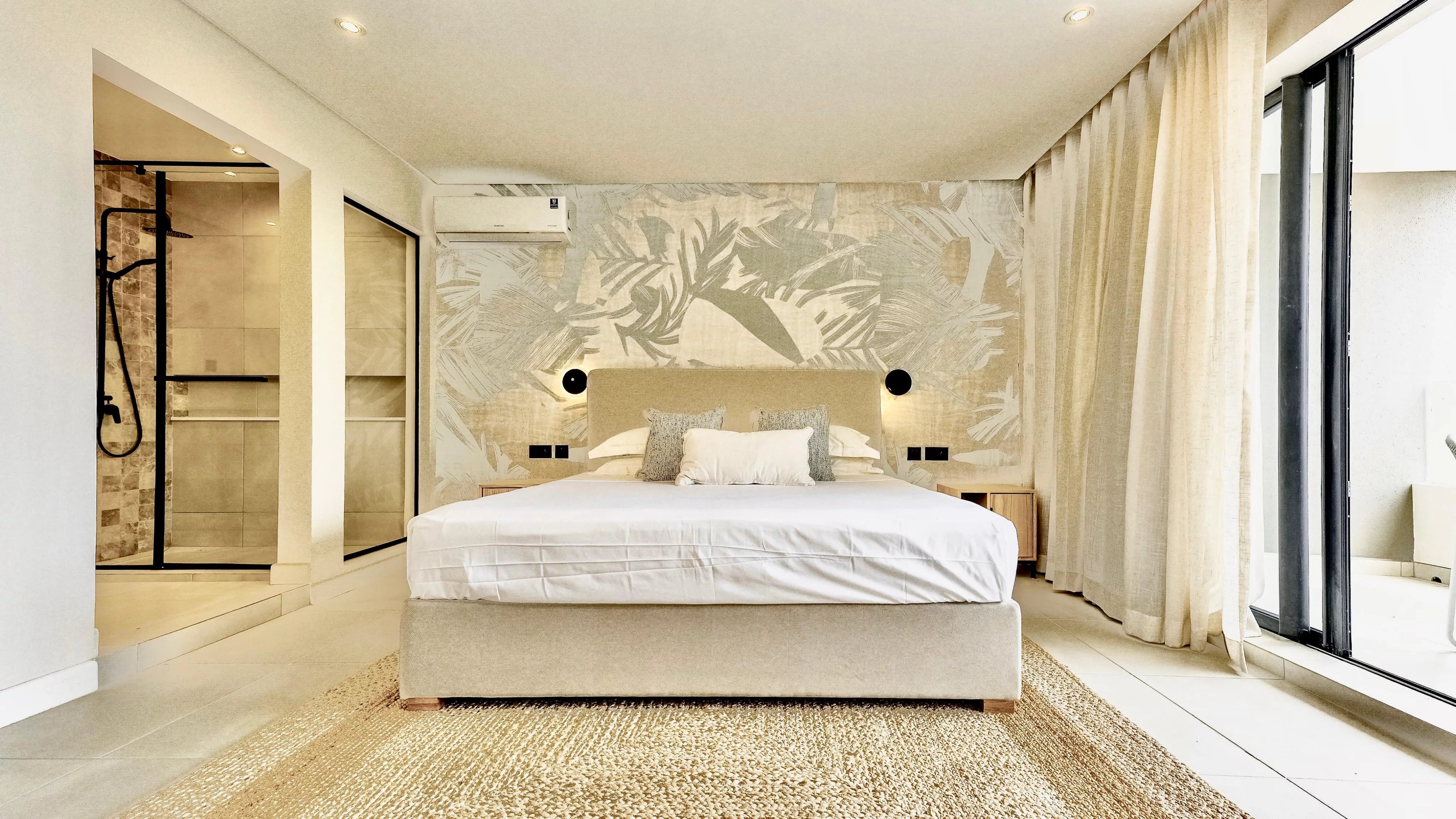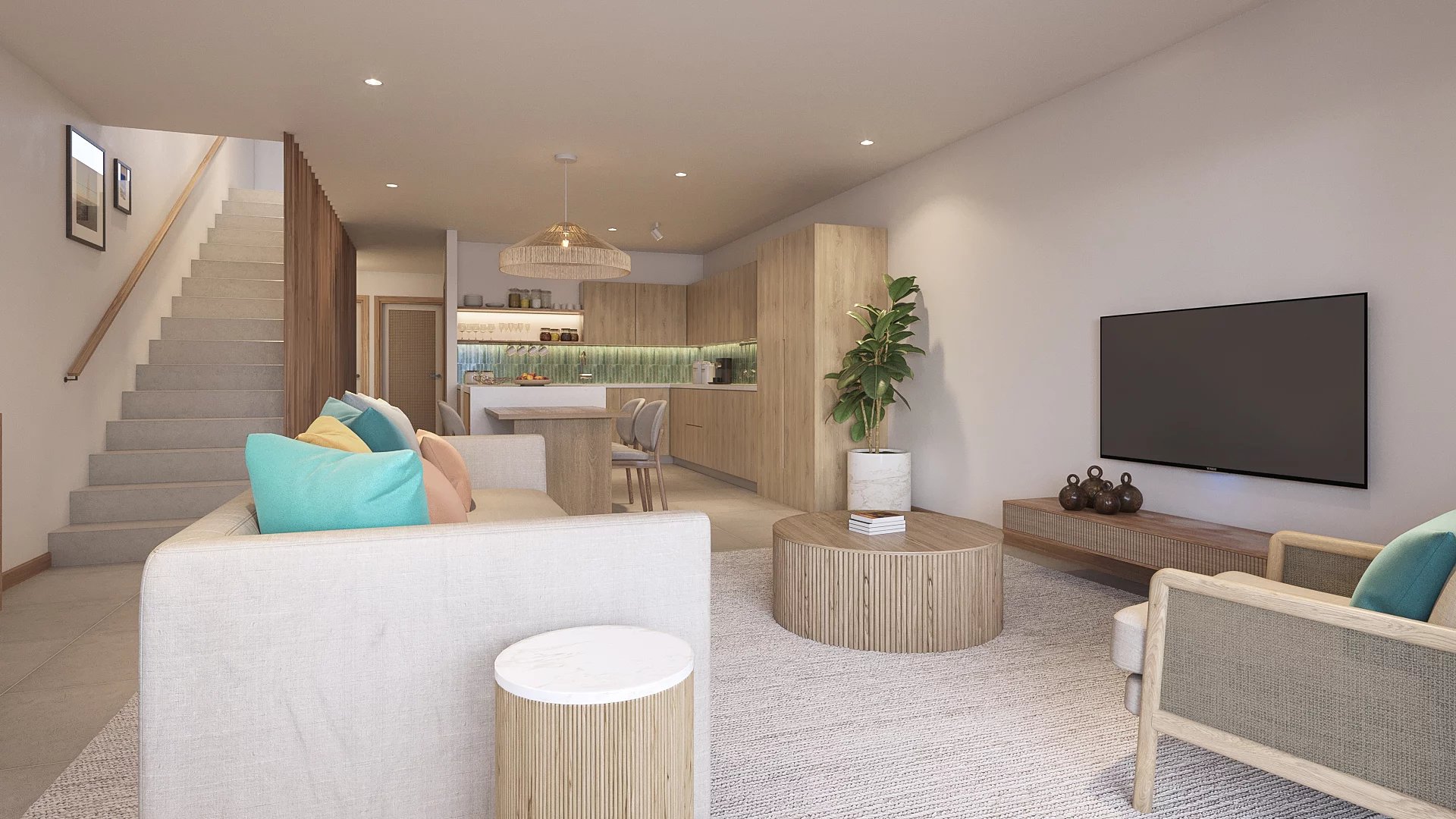 The duplex features three elegant en-suite bedrooms, including a convenient ground-floor suite ideal for guests or multigenerational living. The sea-facing master suite provides a peaceful retreat, while the bright, open-plan living and dining area flows effortlessly onto a private terrace and swimming pool, creating the perfect space to relax or entertain. High-end finishes, complemented by a carefully curated décor package and warm wood accents, enhance the sophisticated tropical aesthetic.