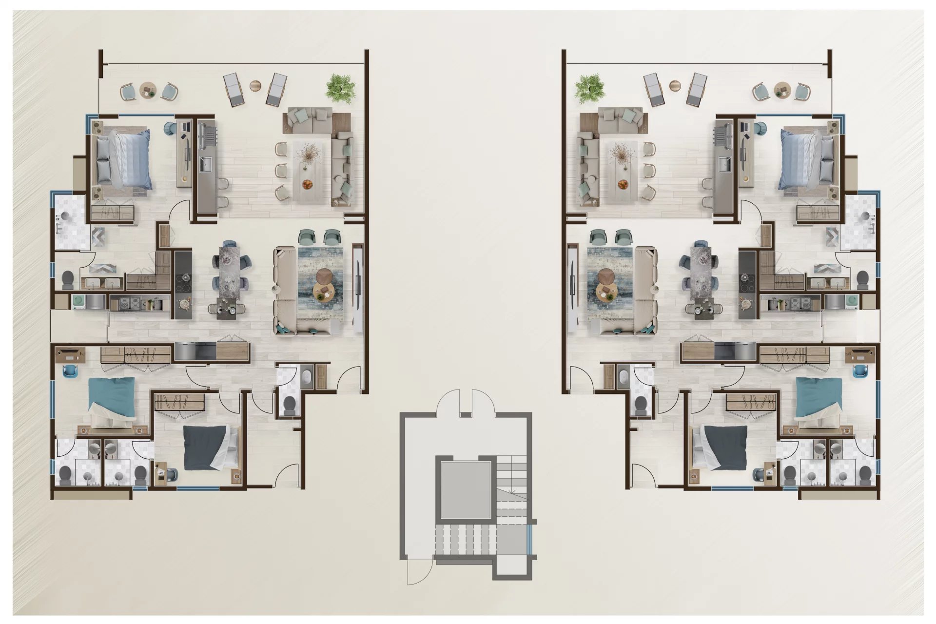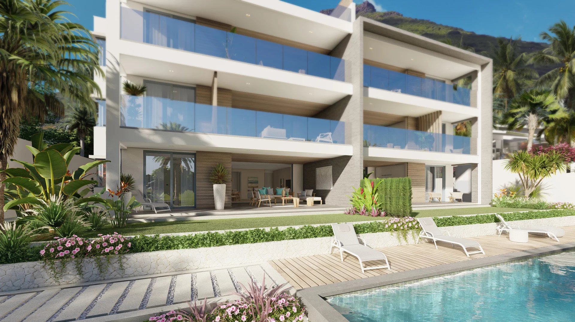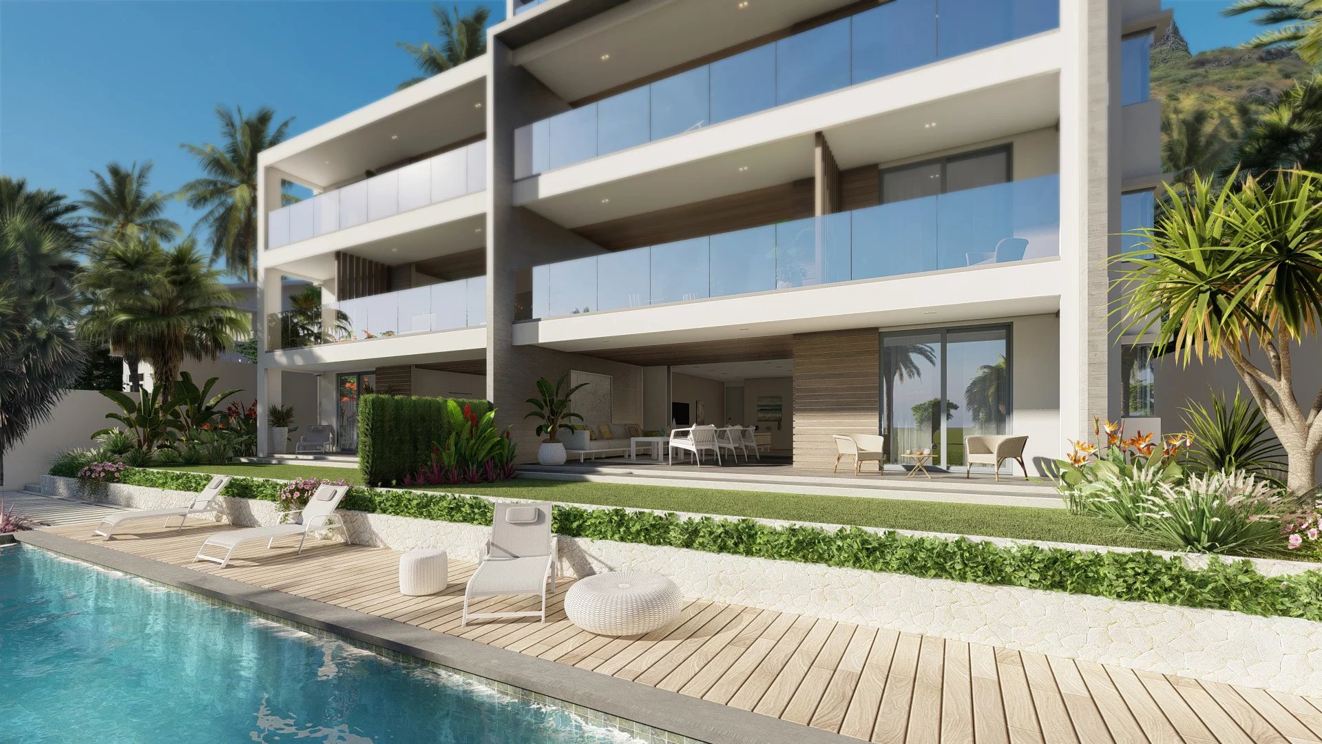 Located on the ground floor, it features three en suite bedrooms and a spacious living area opening onto a 46.2 sqm terrace, with direct access to the garden and the shared pool.