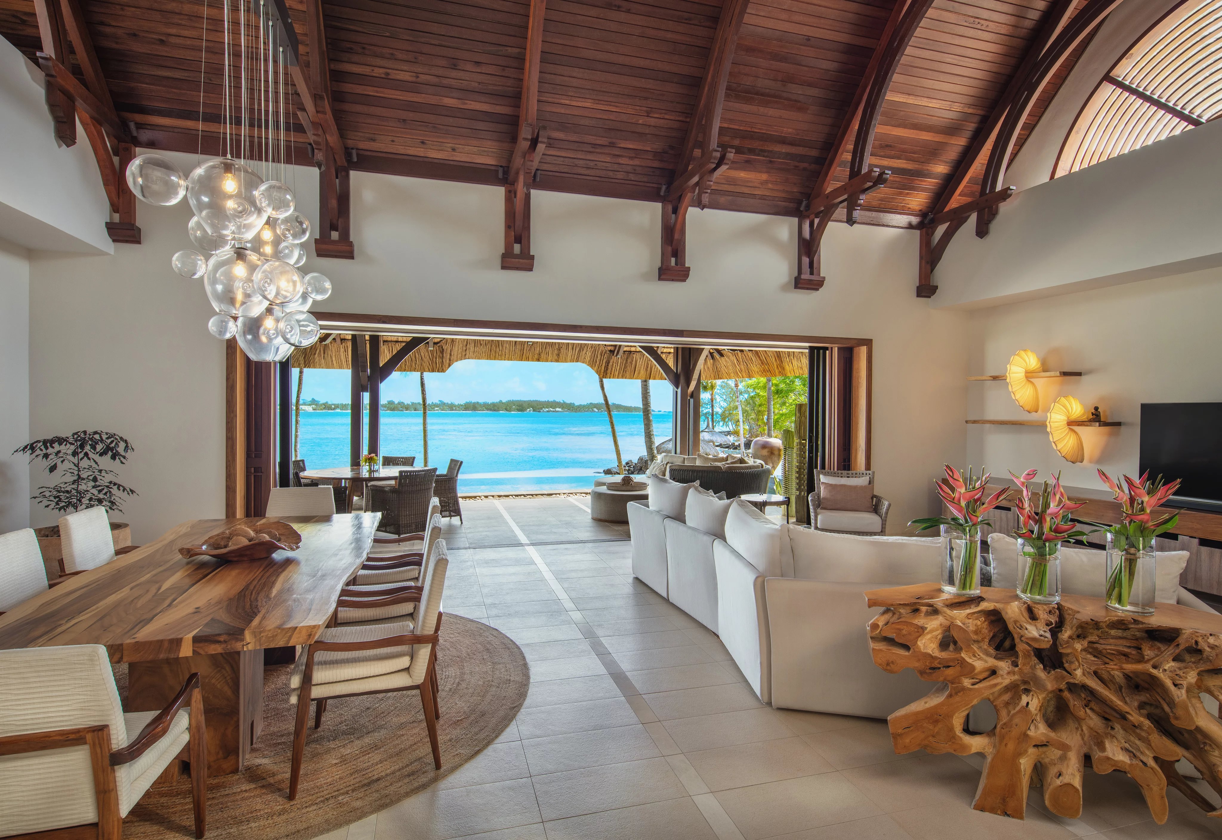 The reception rooms extend onto vast terraces and a spectacular oceanside outdoor lounge. The private pool, perfectly integrated into the landscape, blends into the endless blue sea. Every moment here is extraordinary: sunrises over the lagoon, shaded lunches beneath palm trees, and tranquil evenings by the water.