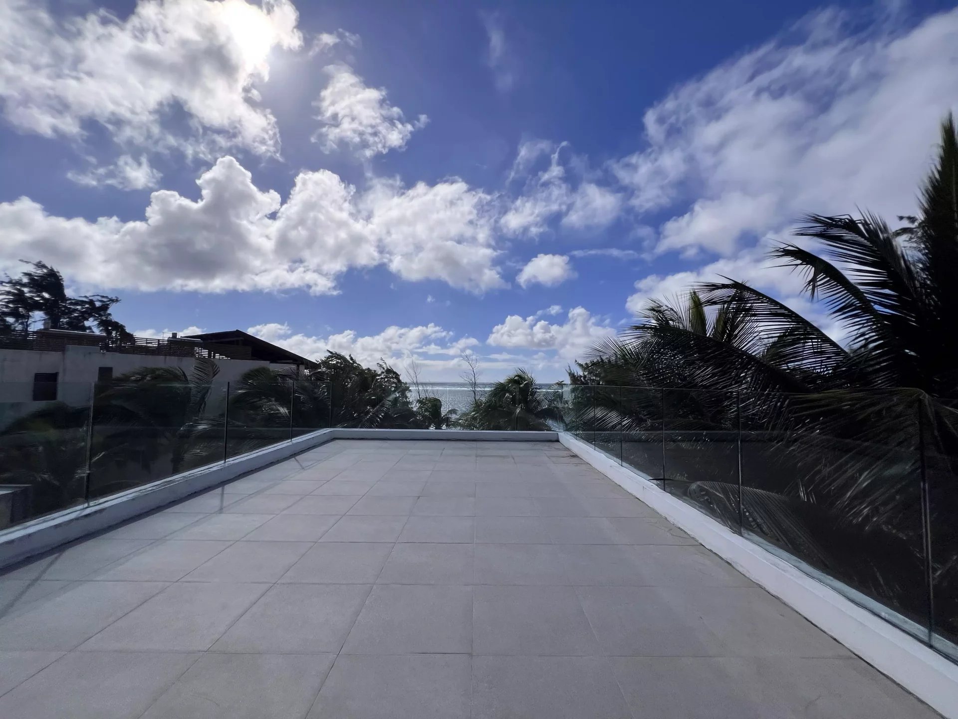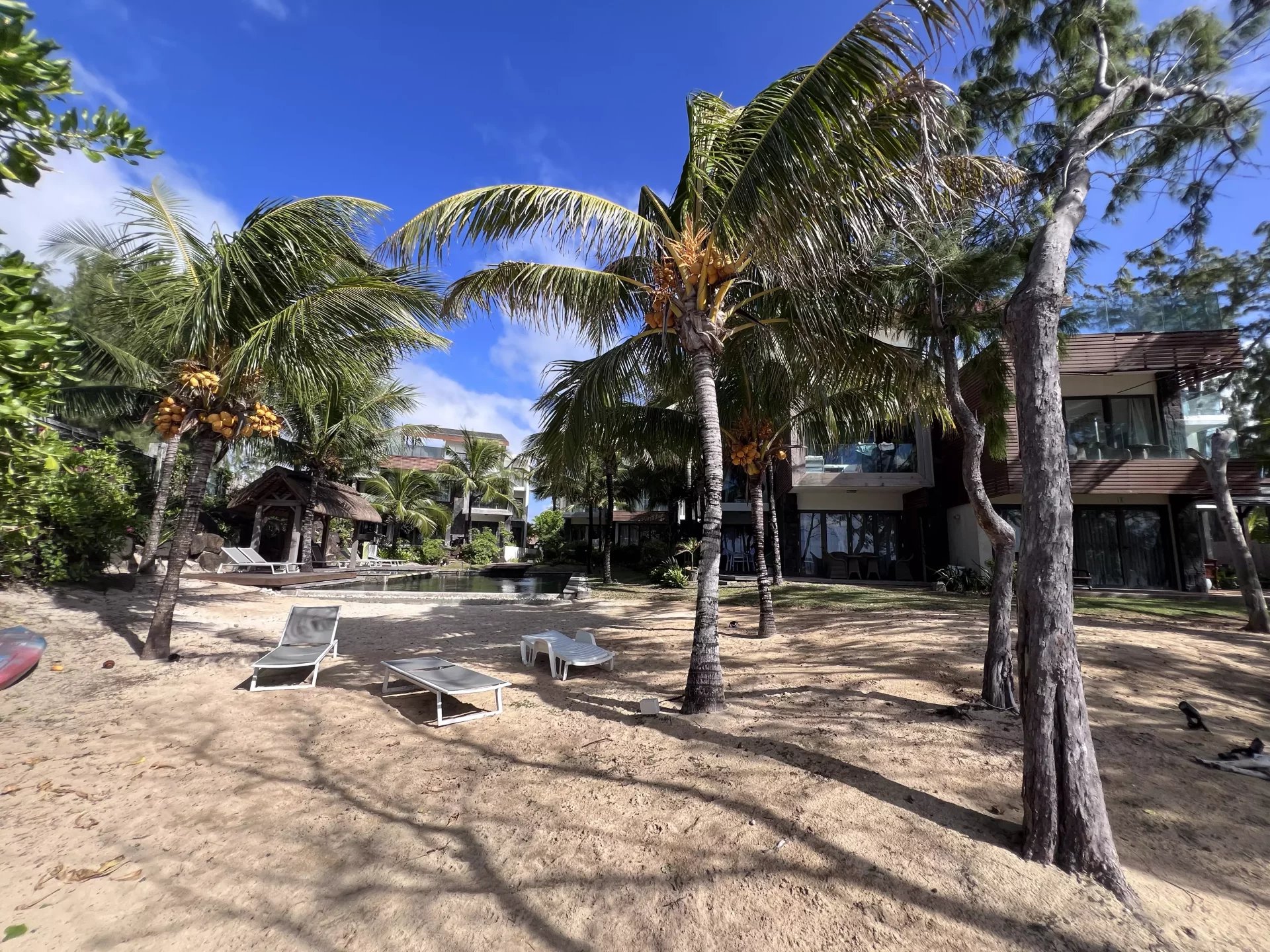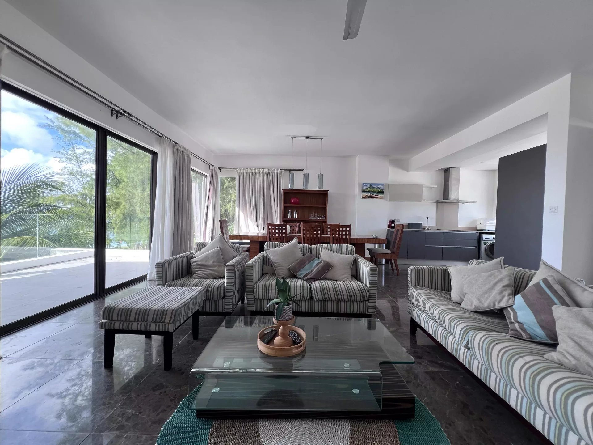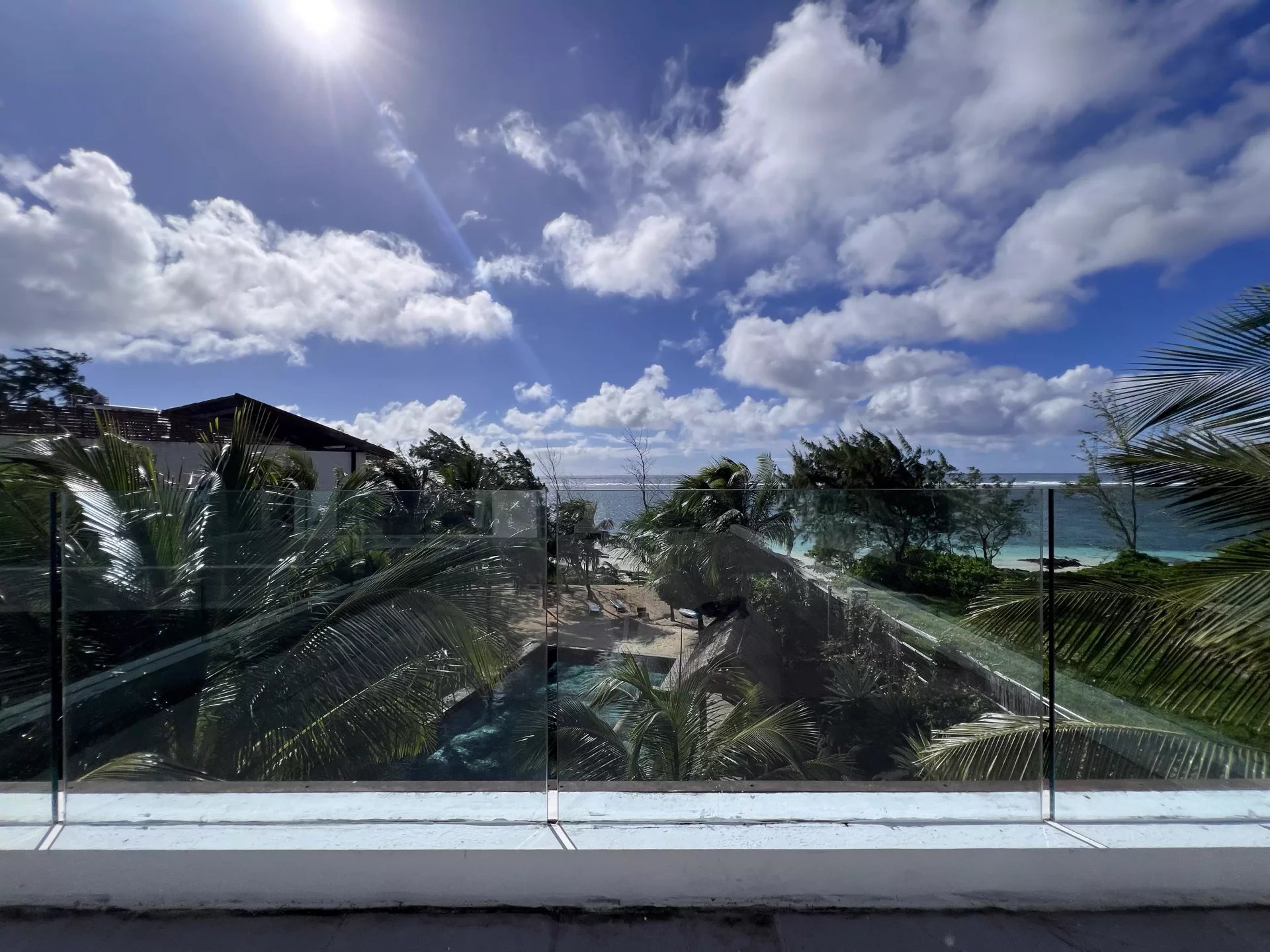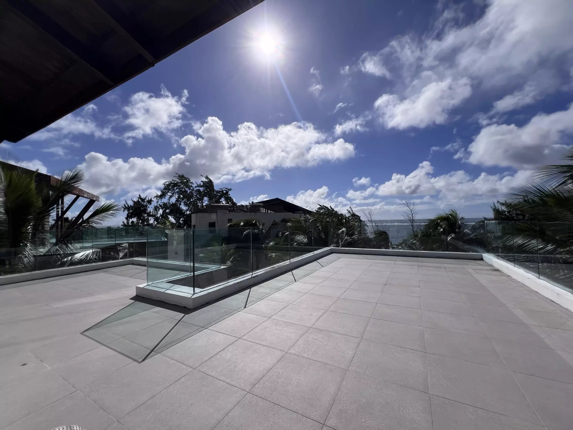 La grande terrasse principale, prolongement naturel du séjour, domine la résidence et vous offre une vue panoramique imprenable sur la piscine, la plage et le lagon turquoise. Un accès direct à la mer complète ce décor paradisiaque.