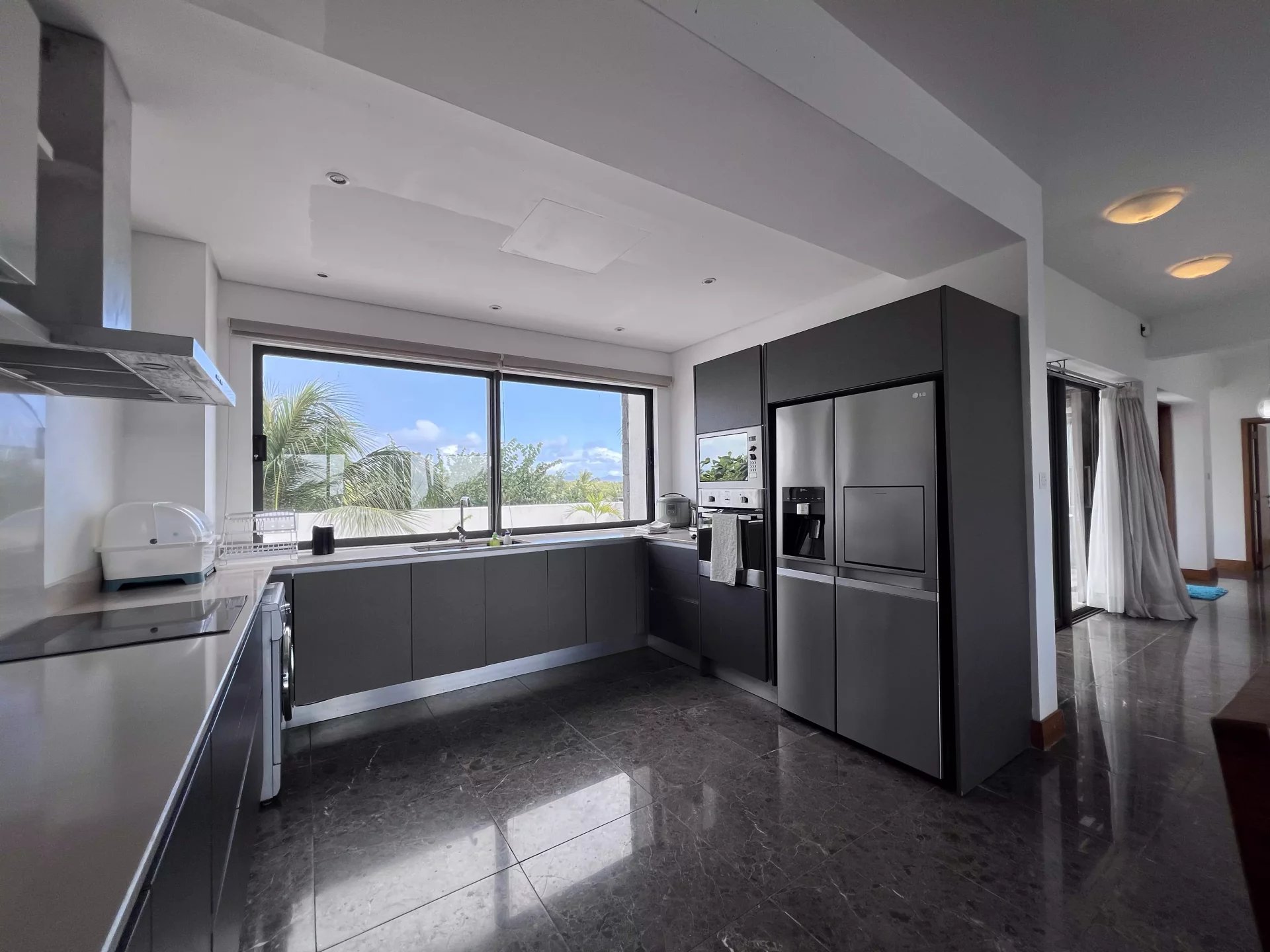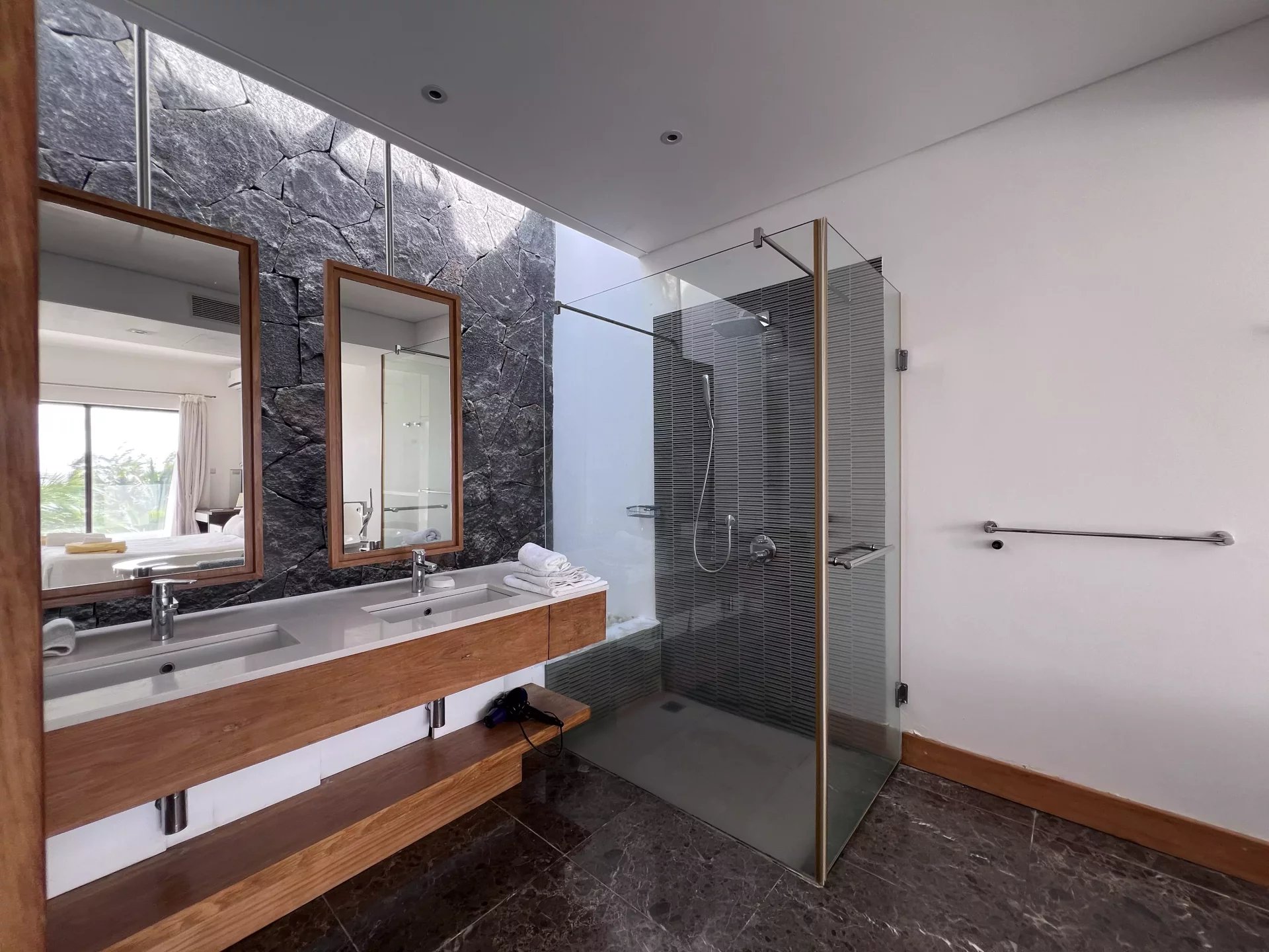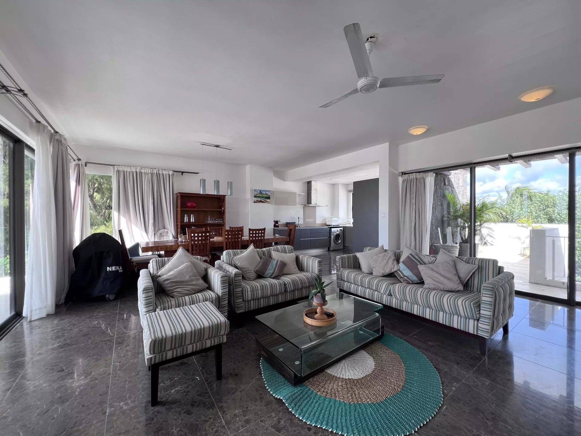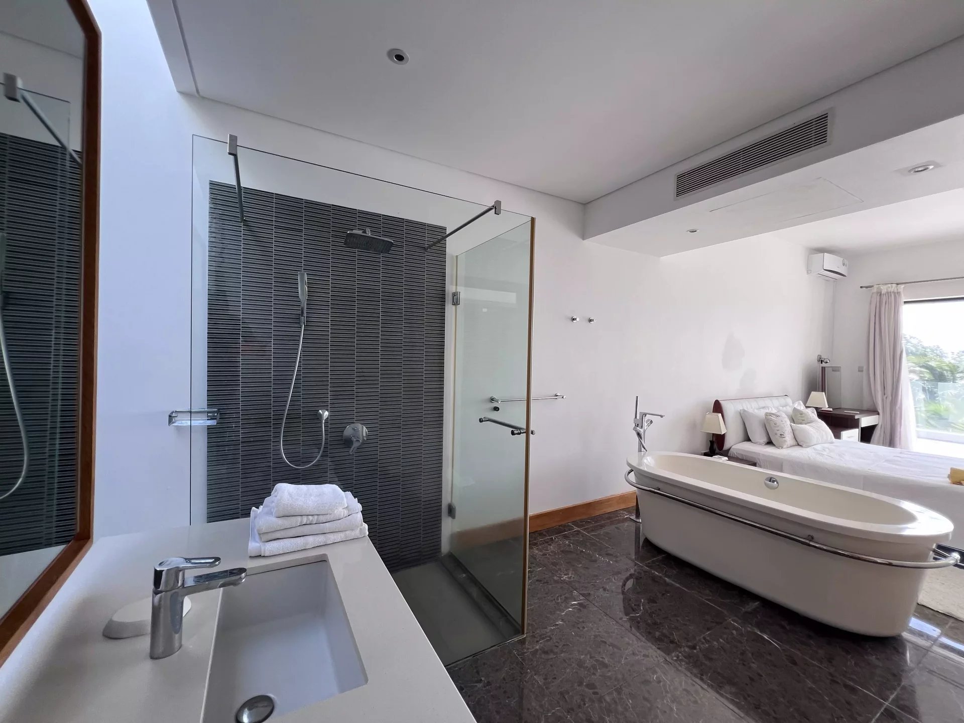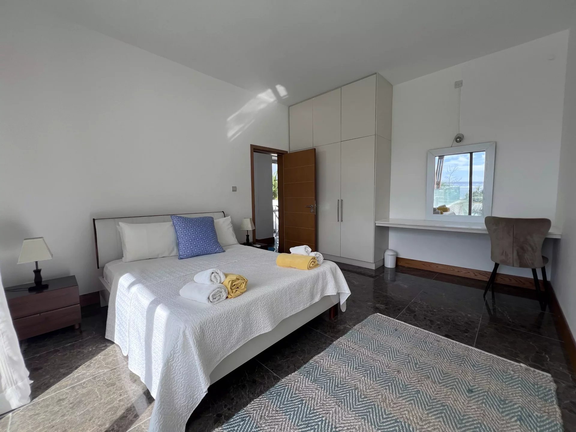 La grande terrasse principale, prolongement naturel du séjour, domine la résidence et vous offre une vue panoramique imprenable sur la piscine, la plage et le lagon turquoise. Un accès direct à la mer complète ce décor paradisiaque.