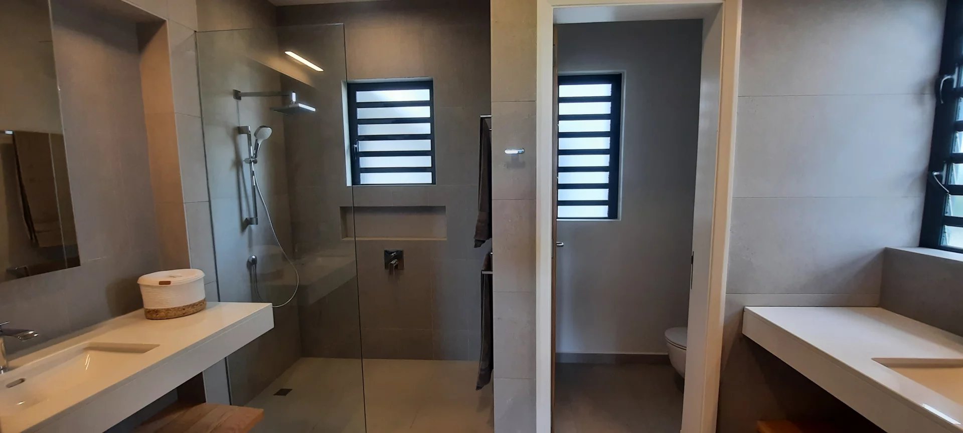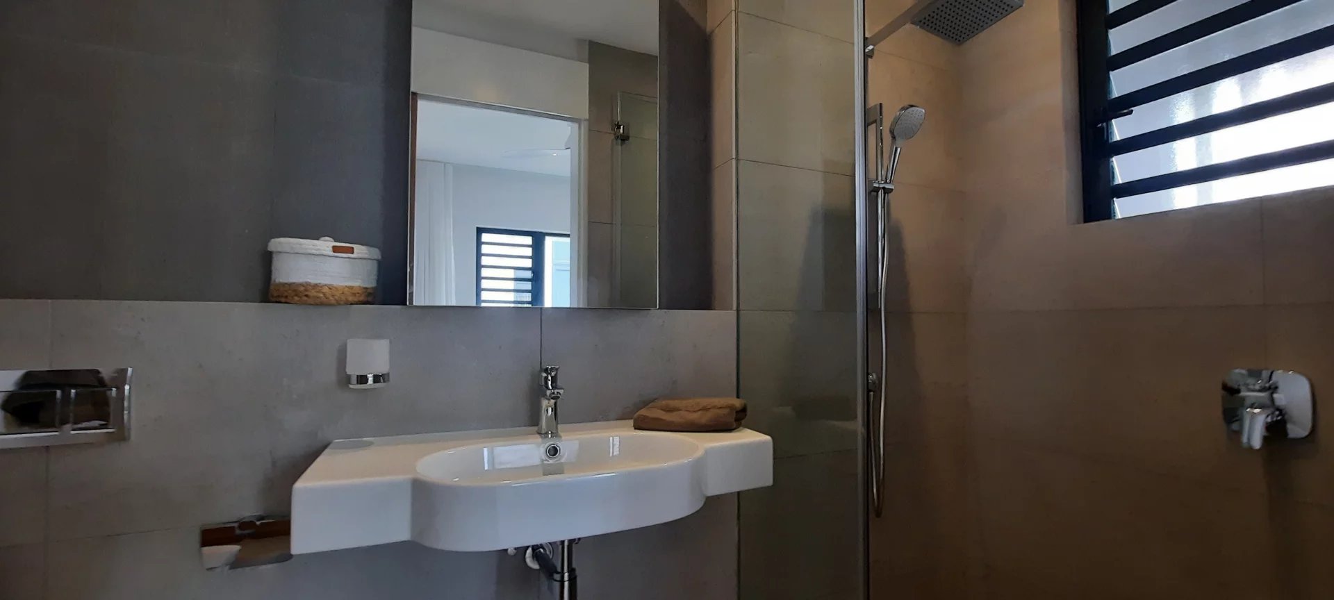 Un couloir mène aux trois autres chambres, toutes climatisées et dotées d’une salle de bains privative.