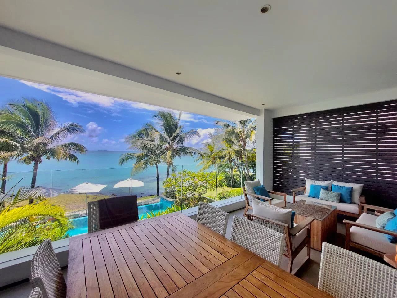La terrasse offre une vue imprenable à perte de vue sur l'île. Que ce soit pour savourer votre café du matin ou organiser des réunions au coucher du soleil, cette terrasse est l'incarnation de la vie luxueuse en plein air.