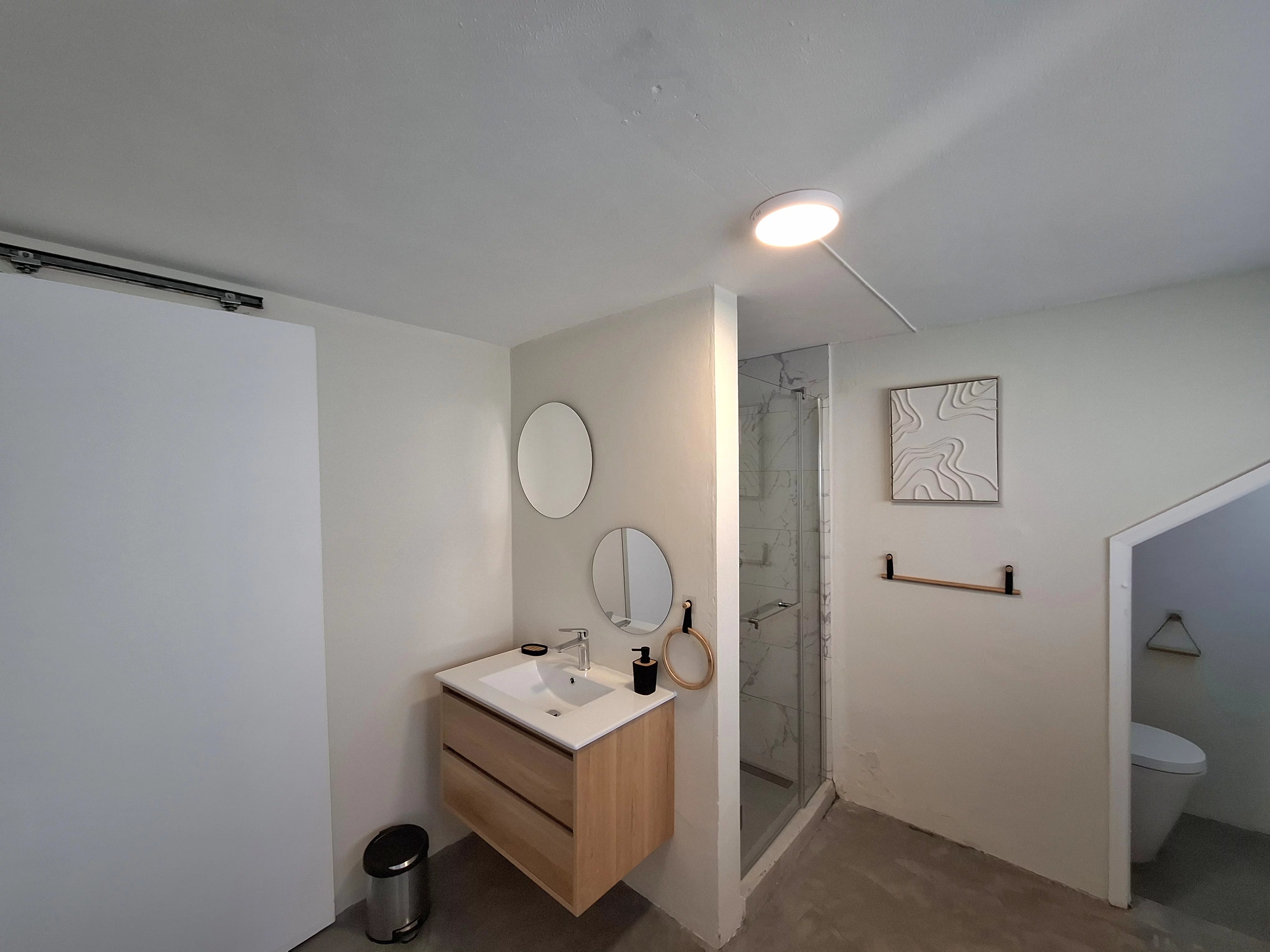 Le rez-de-chaussée dispose d’un salon, d’une chambre et d’une salle de douche, avec deux accès indépendants : l’un par l’intérieur de la maison et l’autre par l’extérieur, offrant une grande flexibilité d’aménagement.