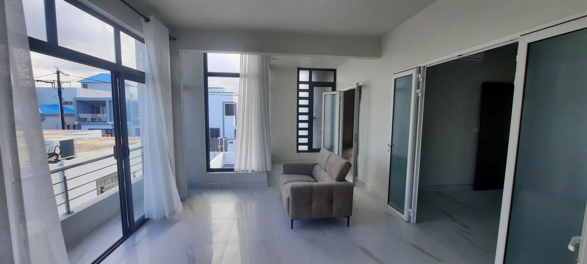 Cette maison neuve de 300 m² est située à 5 minutes du centre de Grand Baie, dans une rue tranquille. Elle est composée d'une belle pièce à vivre lumineuse et confortable comprenant un salon/salle à manger, une cuisine ouverte avec arrière-cuisine, des toilettes pour les invités, et une terrasse faisant face à la piscine. Au rez-de-chaussée, vous trouverez une belle chambre avec salle de bains attenante. À l'étage, se trouvent deux grandes chambres, deux salles de bains, un bureau, ainsi qu'une grande pièce centrale pouvant servir de salle de jeux pour les enfants ou tout simplement de terrasse couverte. Toutes les chambres sont climatisées et il y a un garage. L'atout principal de cette maison réside dans la lumière et les fenêtres qui procurent un agréable courant d'air.
