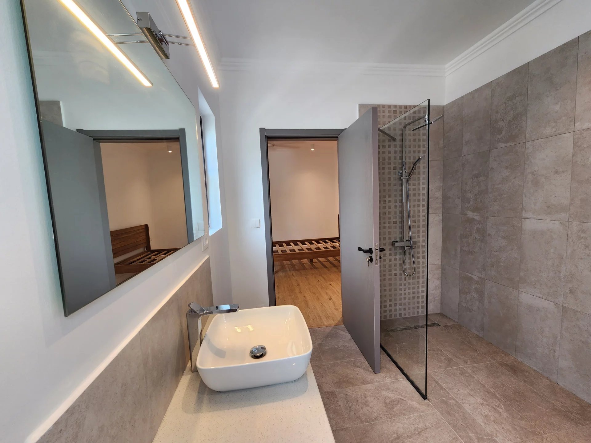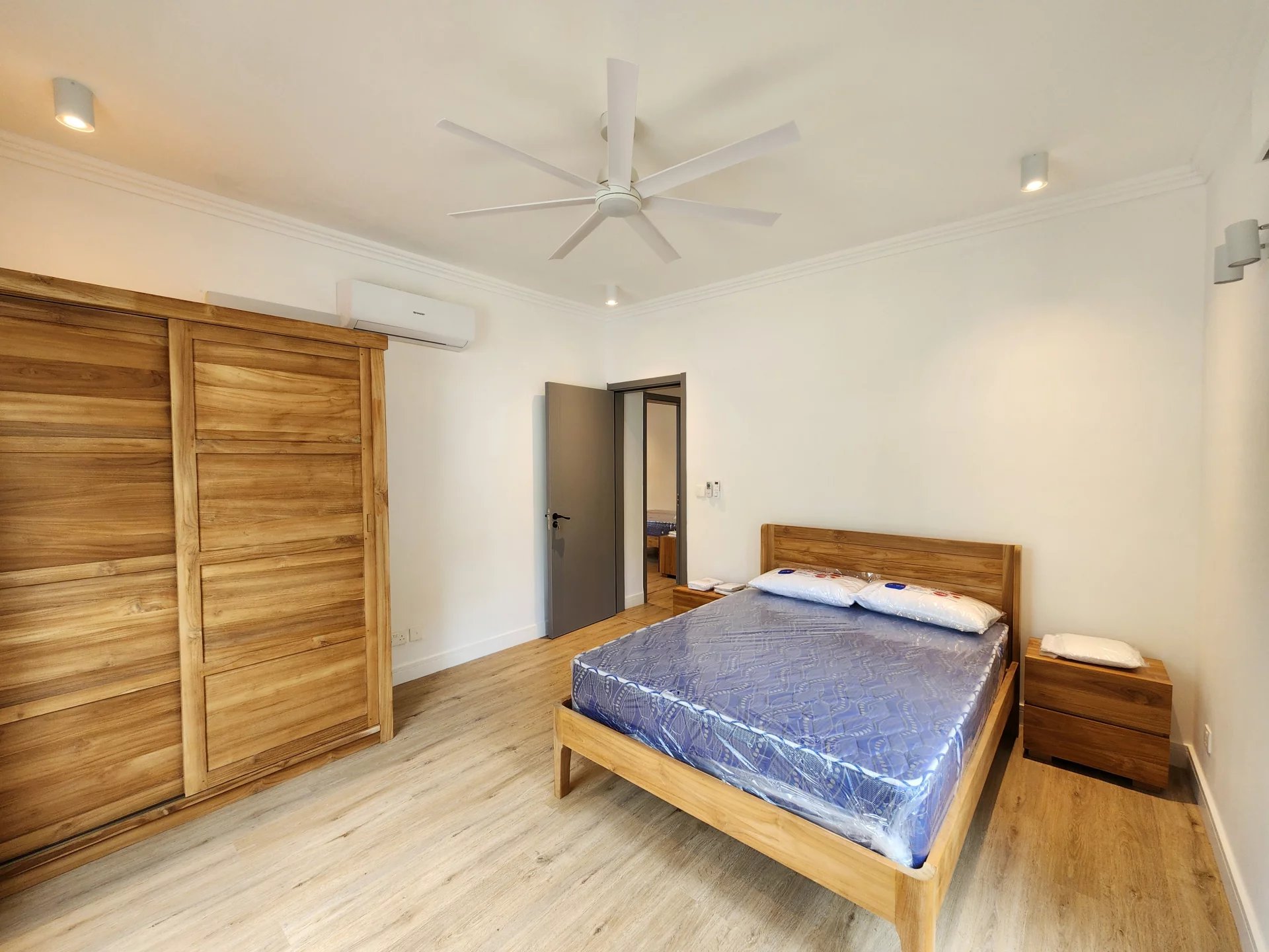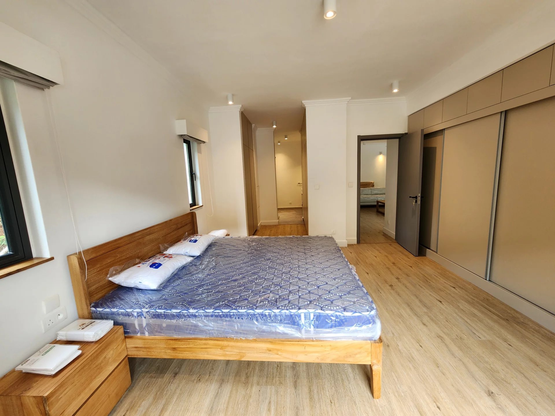 L’appartement dispose d’une spacieuse chambre principale climatisée avec sa salle de bain attenante et son dressing. Une deuxième chambre en suite ainsi qu’une troisième chambre viennent compléter l’espace nuit, accompagnées d’une salle de bain indépendante et d’une buanderie pratique.