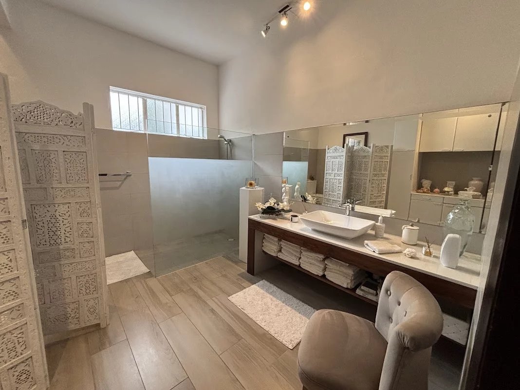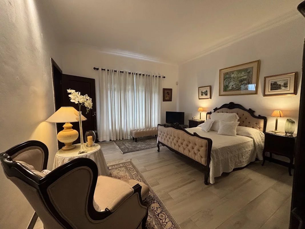 Sur un côté, on accède à la Chambre principale en suite et à son grand dressing et de l’autre à une chambre délicatement meublée et décorée donnant sur sa salle de bain douce et paisible.