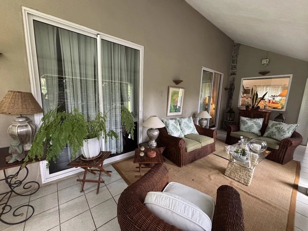 À l’entrée déjà, une somptueuse allée bordée de palmistes donne le ton, elle conduit à la devanture de la maison que l’on a plaisir à découvrir.