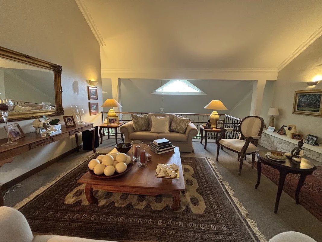 En prenant l’escalier qui trône dans le salon éclairé par un magnifique lustre en crystal, on arrive sur une belle pièce à vivre où l’on peut écouter de la musique, jouer du piano et lire ou se reposer tellement la pièce est spacieuse et reposante.