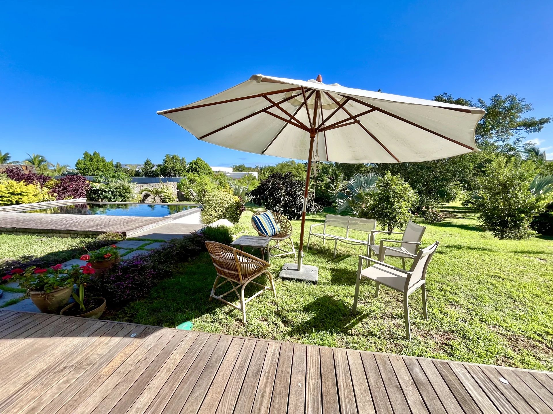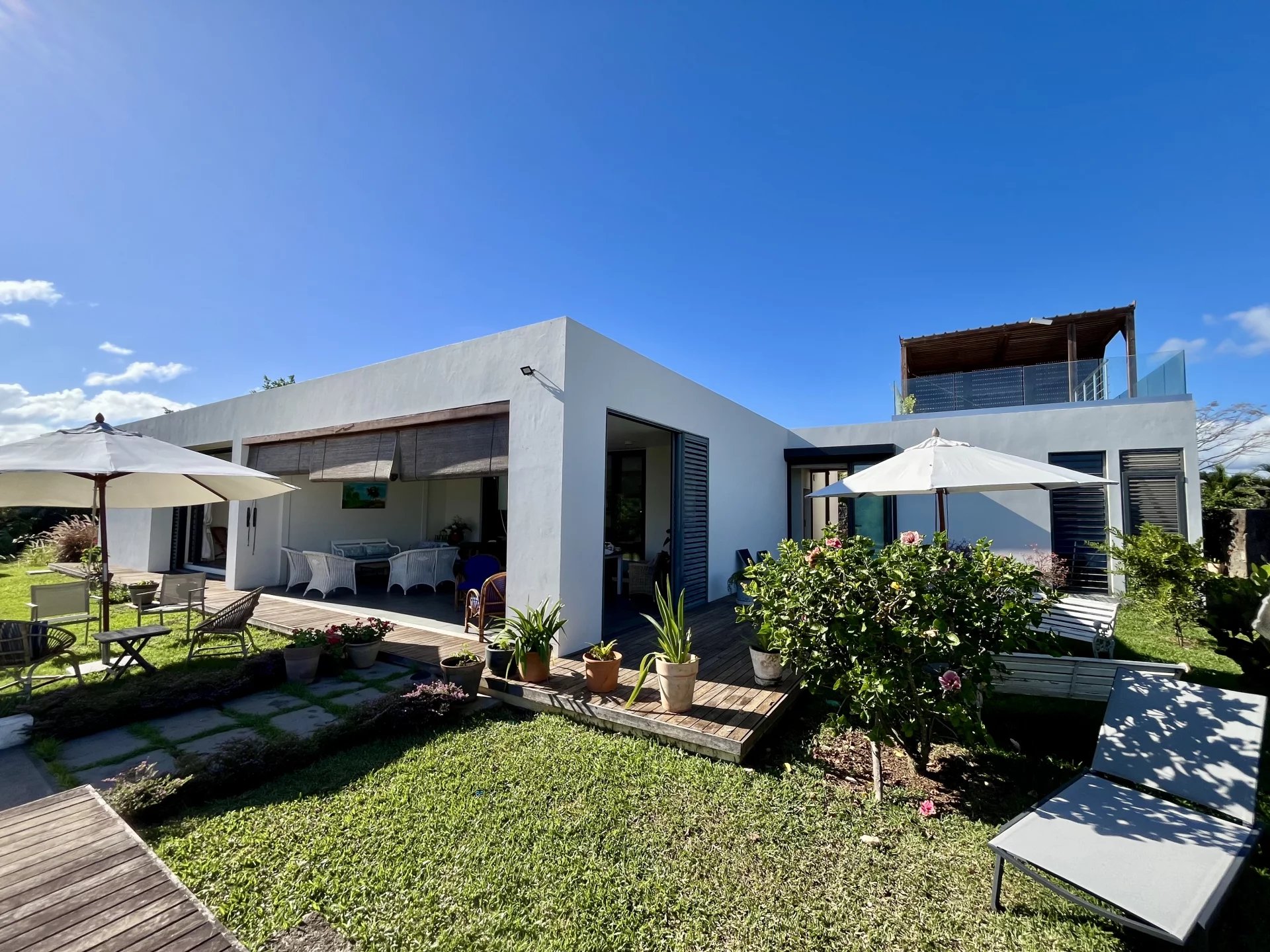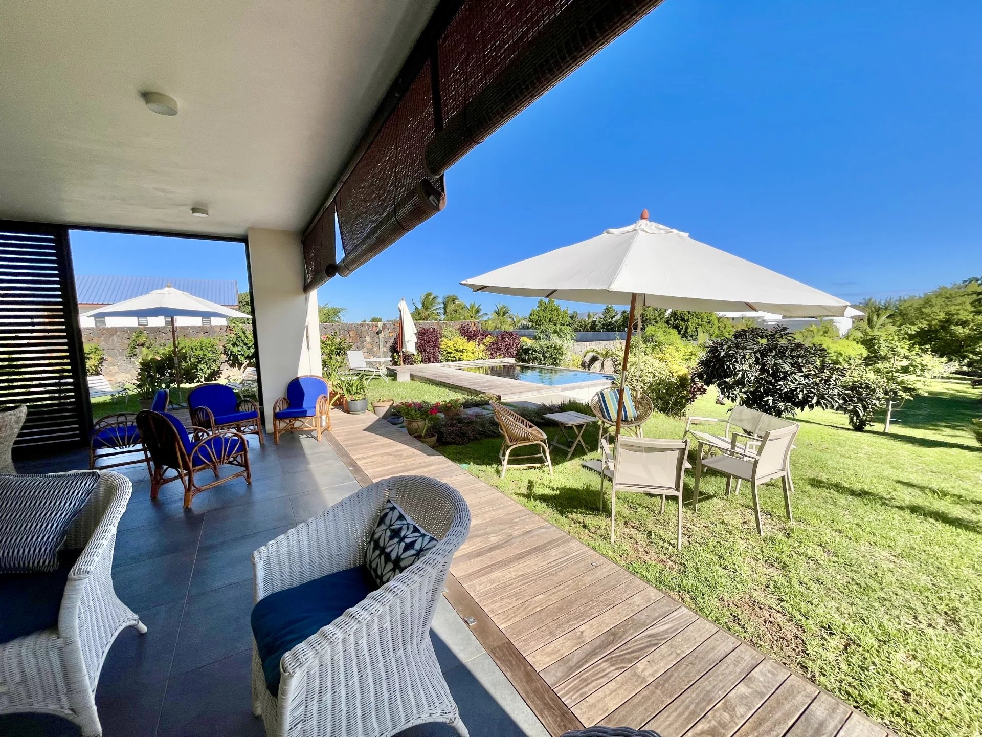 Vous apprécierez la commodité du garage électrique avec espace pour une voiture, ainsi que le générateur sur place pour assurer une alimentation électrique ininterrompue. Profitez d'une baignade rafraîchissante dans votre grande piscine privée ou détendez-vous parmi les différents arbres fruitiers de la propriété, qui ajoutent à l'ambiance sereine et verte. La terrasse sur le toit offre des vues magnifiques, en faisant un endroit idéal pour se détendre.