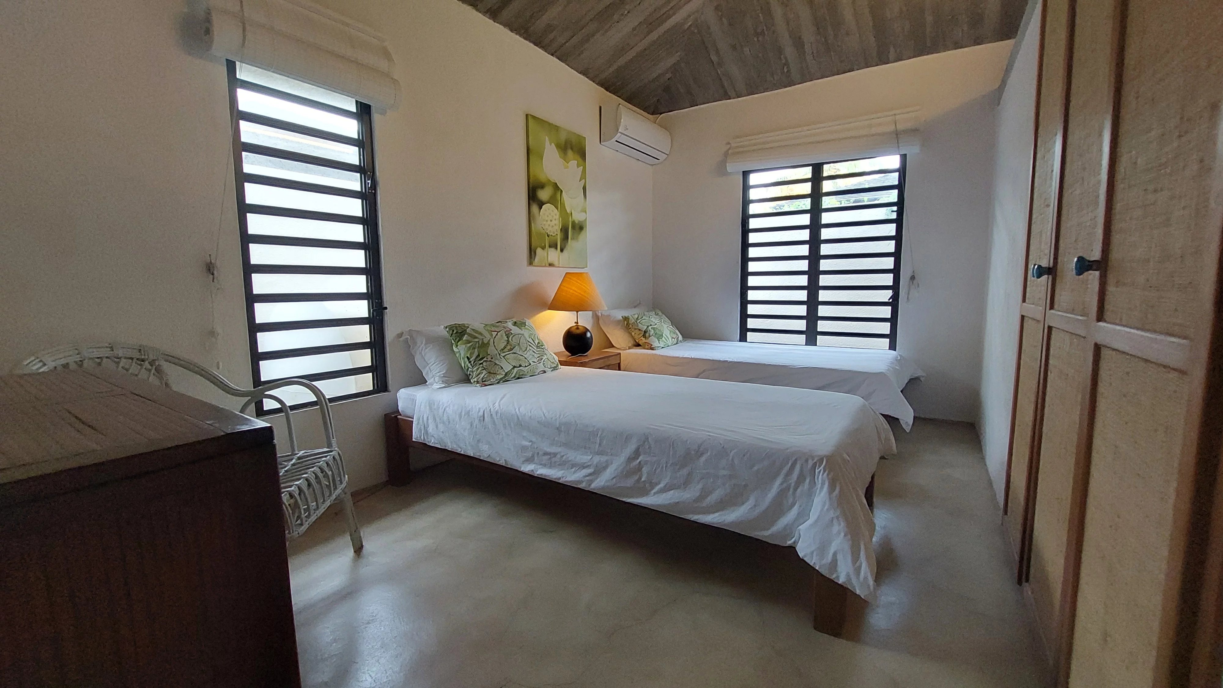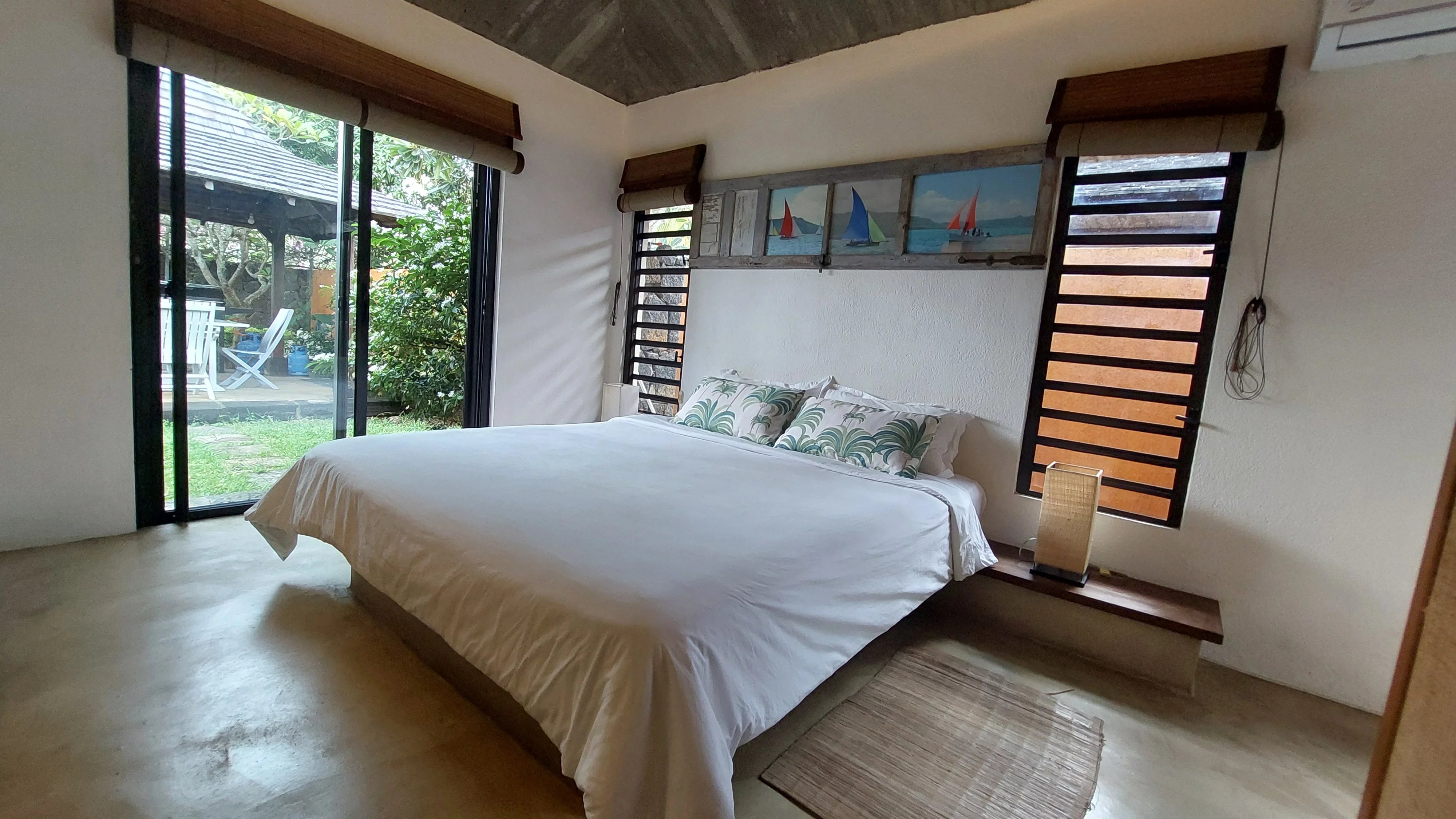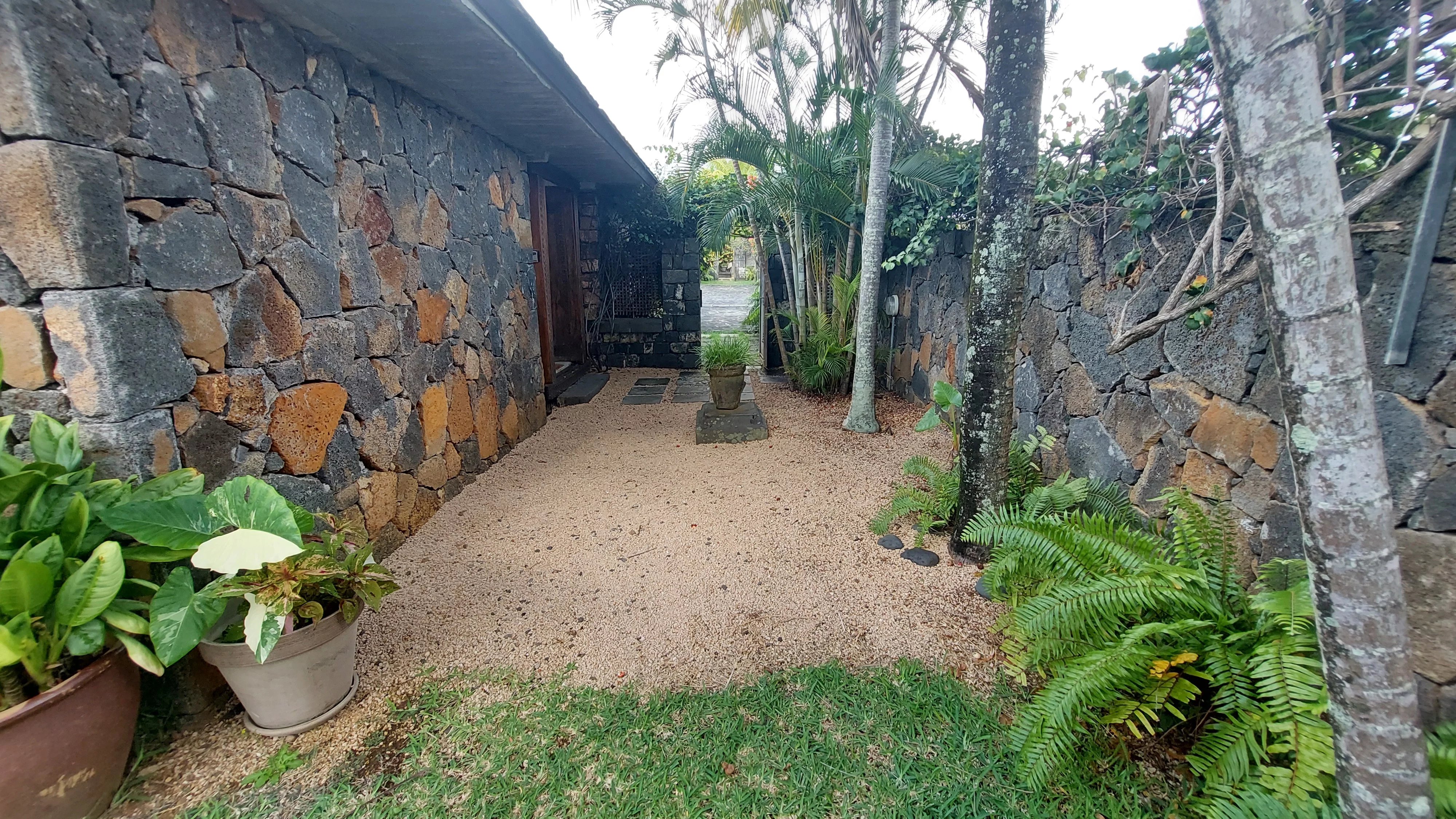 Meublée, elle comprend une cuisine américaine entièrement équipée, une buanderie, trois chambres climatisées et deux salles de bains. La chambre principale dispose d'une salle de bain attenante. Les deux salles de bains offrent une atmosphère naturelle et zen avec chacune un petit jardin.