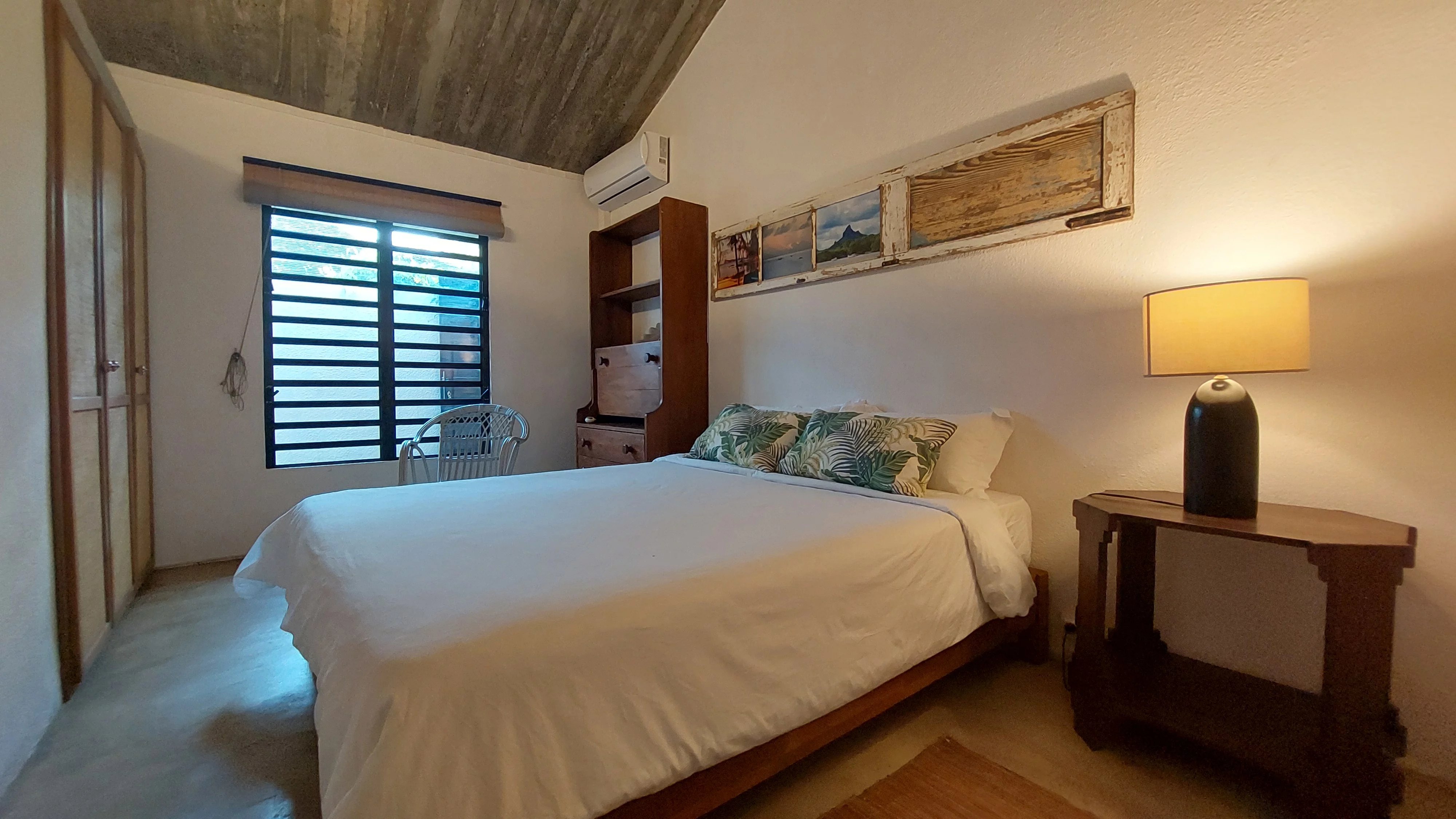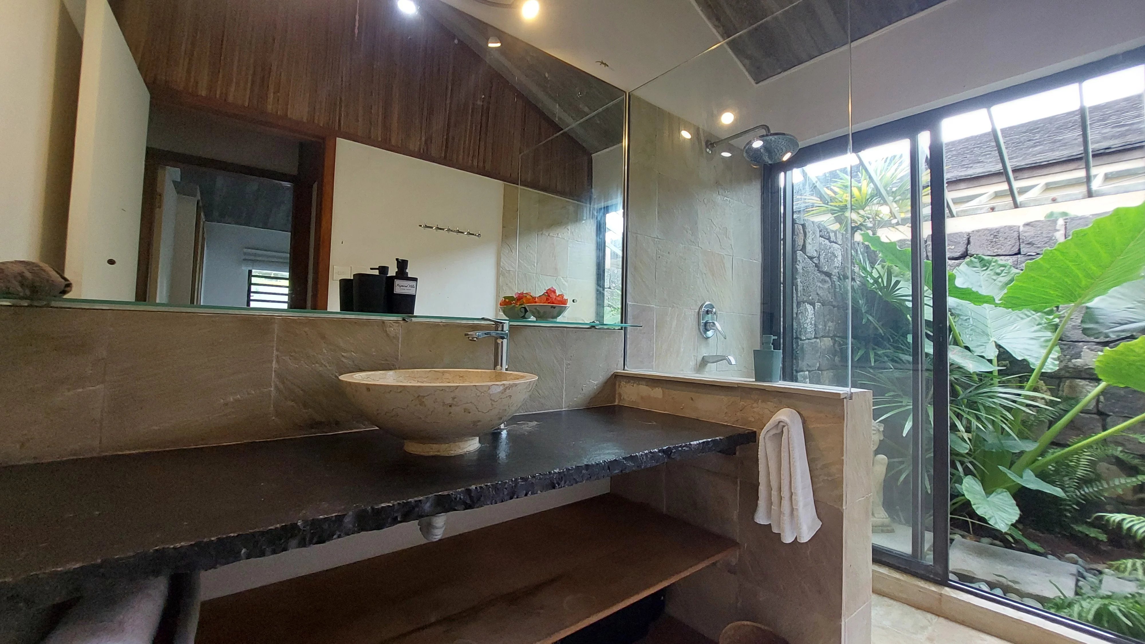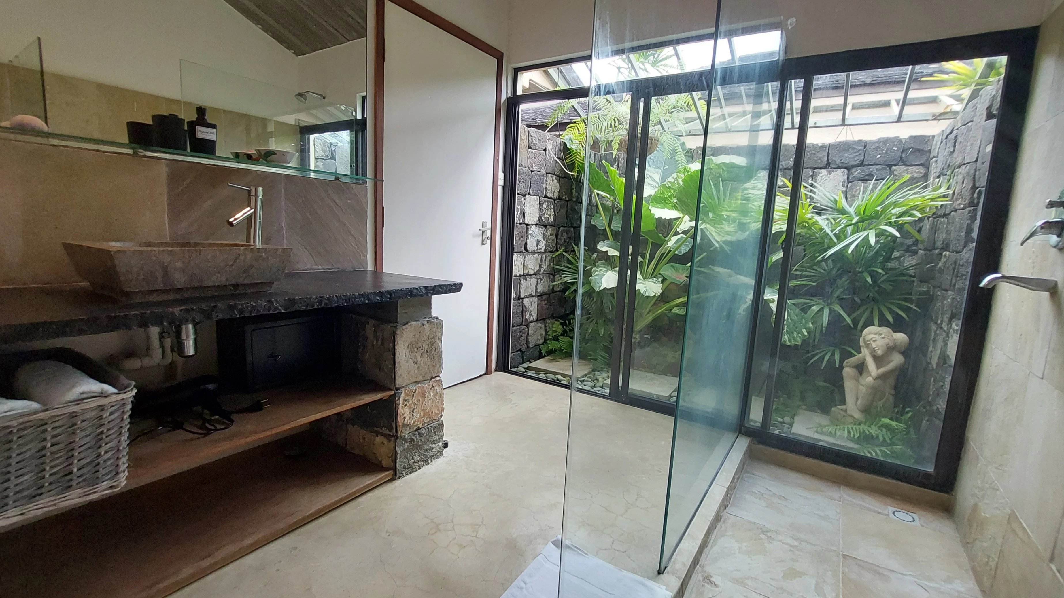 Meublée, elle comprend une cuisine américaine entièrement équipée, une buanderie, trois chambres climatisées et deux salles de bains. La chambre principale dispose d'une salle de bain attenante. Les deux salles de bains offrent une atmosphère naturelle et zen avec chacune un petit jardin.