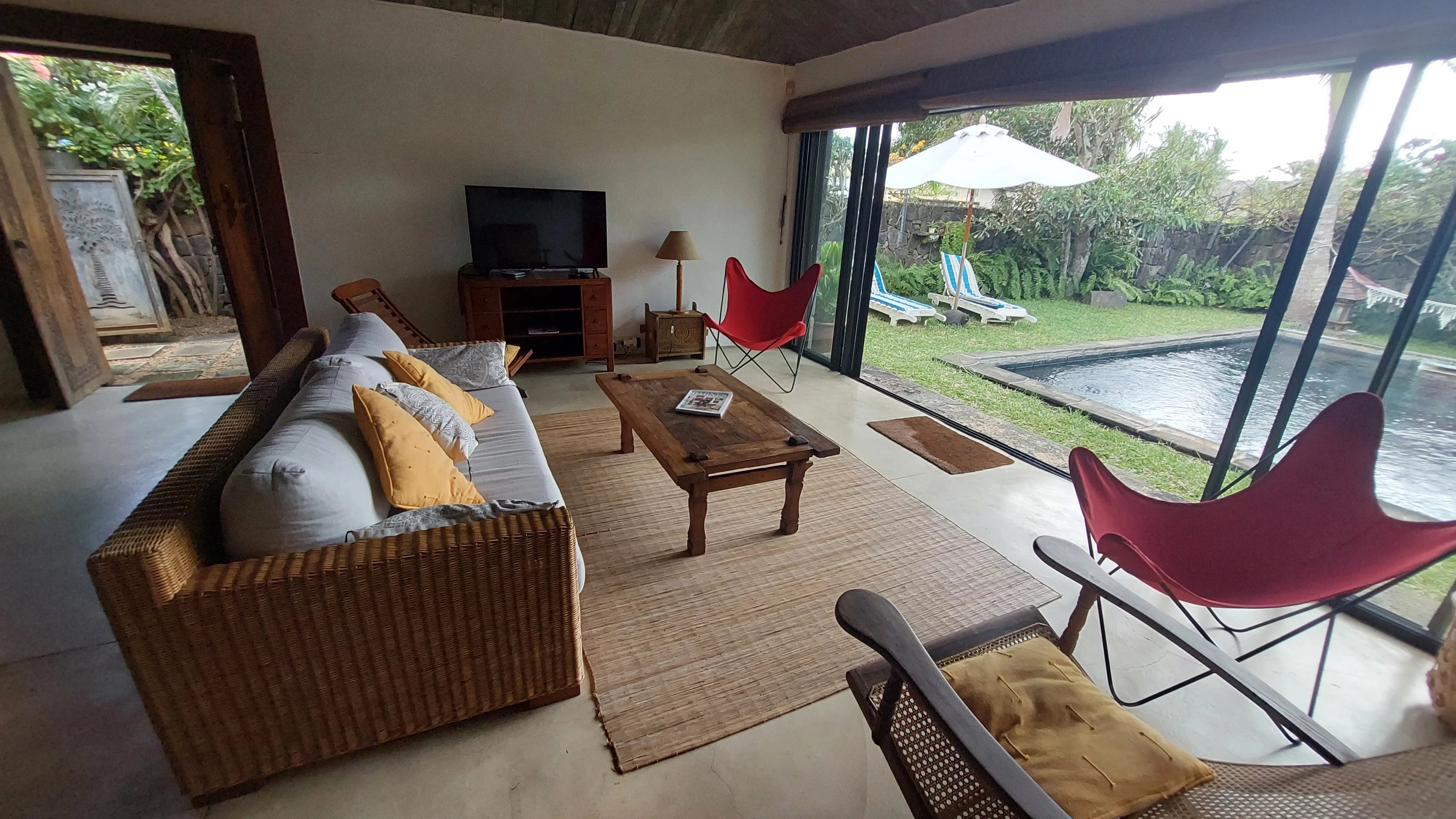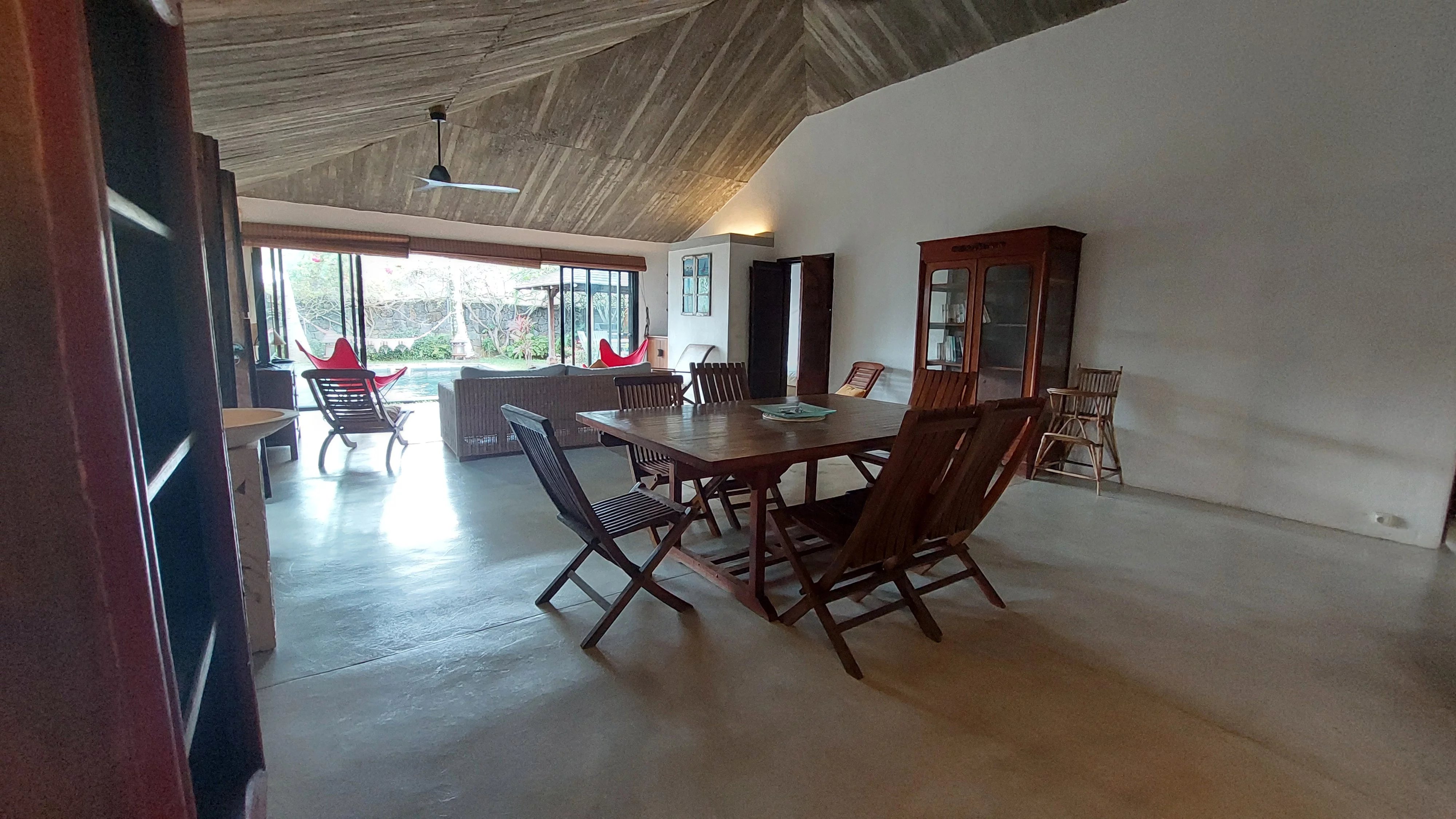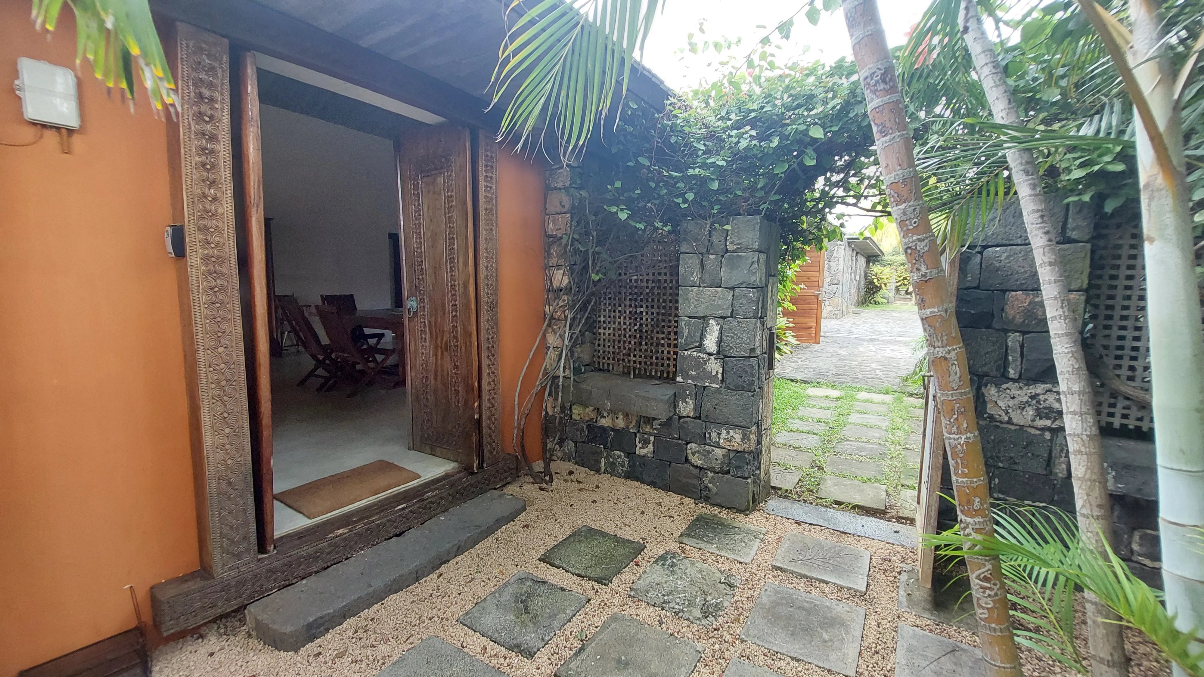 À l’entrée de la maison, vous êtes accueilli par une belle porte en bois sculptée qui s'ouvre sur un grand espace de vie avec vue sur la piscine et le jardin.