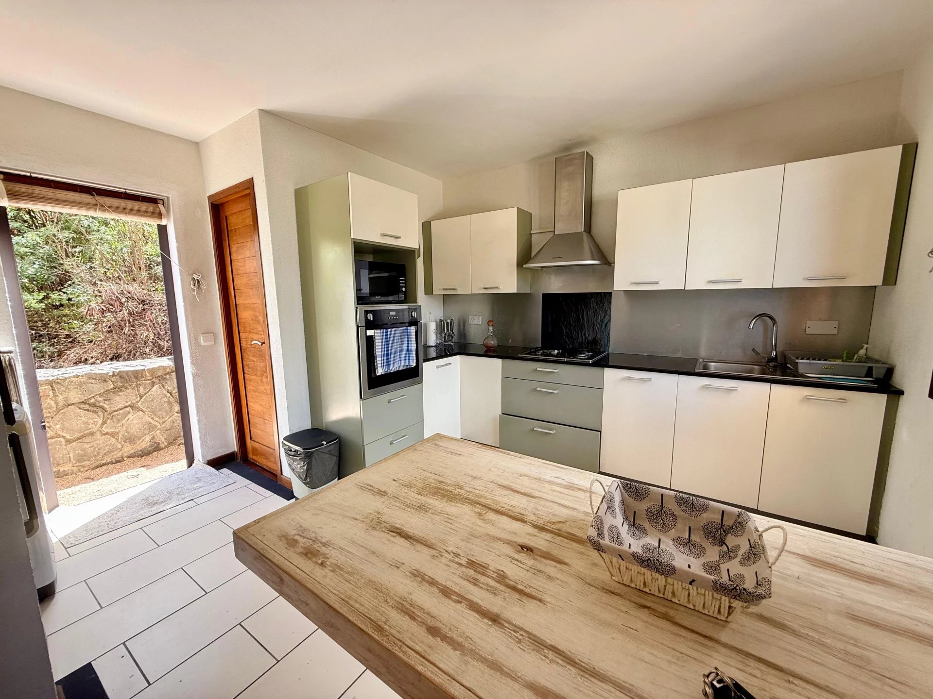 Le chaleureux salon est aménagé avec un espace TV et s’ouvre sur une agréable terrasse extérieure, meublée d'un salon de jardin et d'une table à manger — idéal pour profiter des soirées tropicales et des magnifiques couchers de soleil.